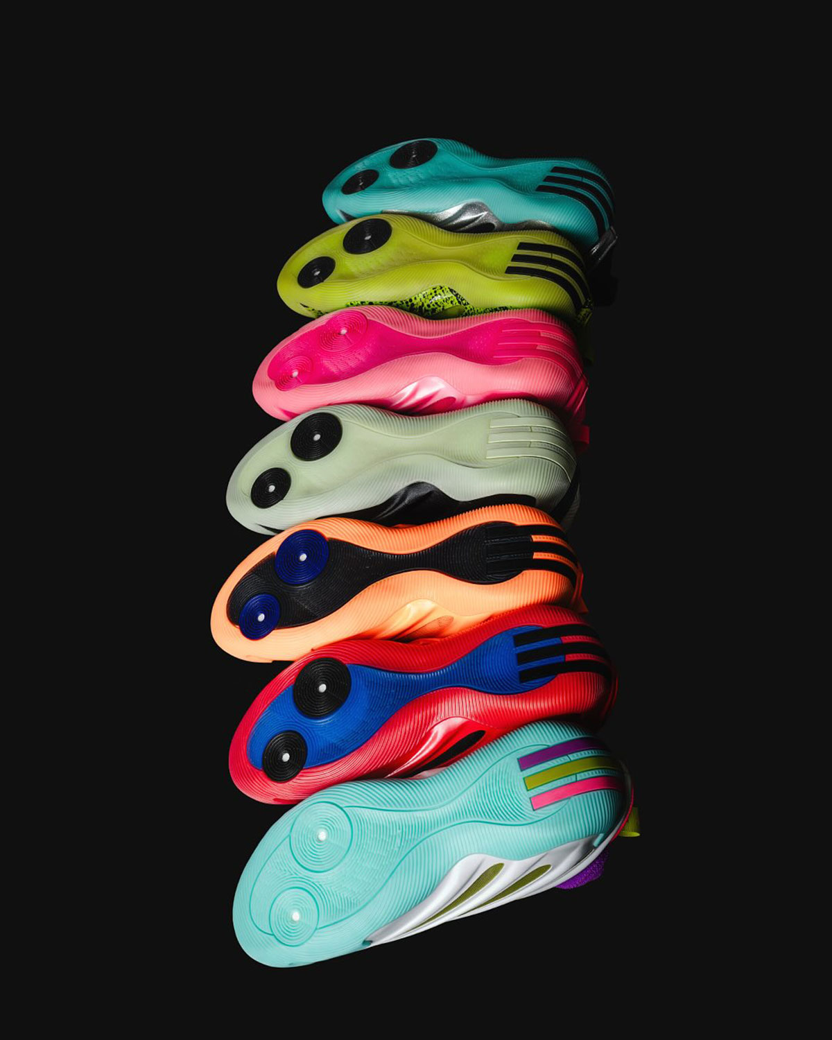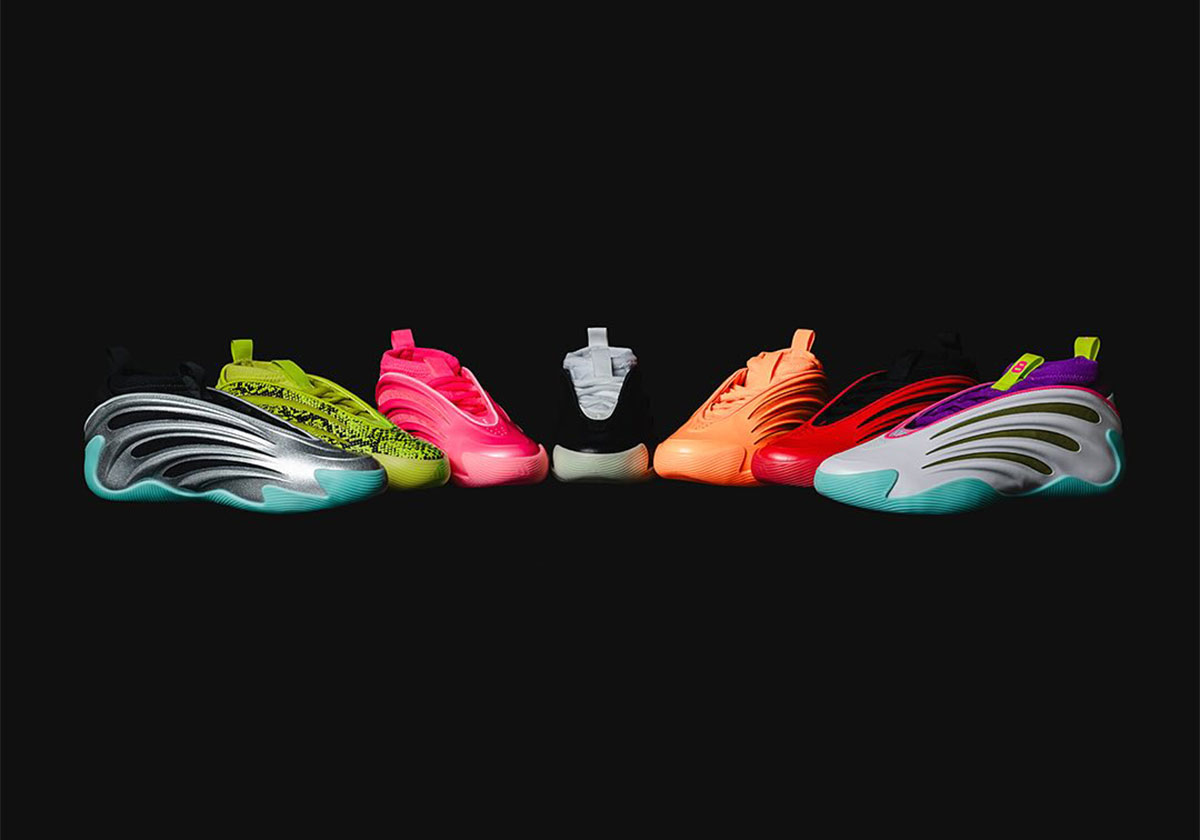 In this cadre of new looks, the easiest to digest are the “Red Metallic” and two tonal looks in the all-pink and the all-peach “Dynamo,” suitably lining up with some of the simplistically blocked pairs that have hit the streets already. However, there’s plenty of experimentation on display as the silhouette looks to its next chapter. The middlemost pair showcases leather siding next to a white inner bootie, while a neon green switches into snakeskin exteriors and the grey/teal/black “UNO” taps into glittery patterns on its cage. Finally, NBA fanatics will likely be familiar with the last pair, an eccentric blend of royal purple, light green, and white that the Thunder’s Jalen Williams and Lu Dort have been sporting throughout their team’s playoff run.