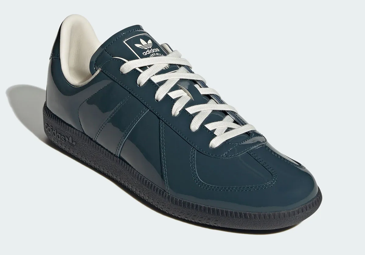 In 2024, adidas revived their BW Army trainer through a collaboration with Hartcopy. The slim silhouette originated in the 1970s, when the Three Stripes produced the model specifically for theWest German Army. Beloved by the soldiers who wore it, excess pairs were sold off to the public after the fall of the Berlin Wall, and the BW Army became a special piece of adidas’ history. In Spring 2025, the brand issued their first in-line pairs of the Army retro, and have quietly kept the model in stock over the past year, offering a much more approachable (cheaper) version than the Replica version made by Margiela, who simply copied adidas with a higher price point. This week, adidas is offering two new styles of the BW Army with some patent leather flare, dressing the shoes in either triple black or a smooth teal style.