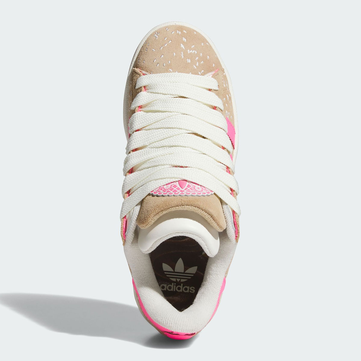 The adidas Campus 00s here takes after the pan de muerto with a tan suede base, white stitching for the anise seeds, and pink hits on the stripes, heel, and tongue for the sugar. The heel features wavy paneling meant to look like a glaze, while the tongue comes with a custom pink Trefoil befitting of the Día de Muertos theme. This version of the Campus 00s features two tongues for extreme padding; a tan suede outer tongue and white leather tongue inside.