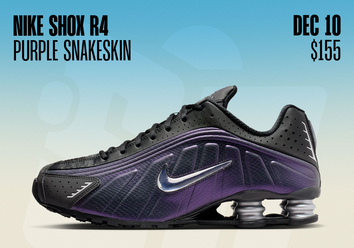 It’s all quiet on December 10th save for the Nike Shox R4 “Purple Snakeskin,” an attention-grabbing overhaul of the piston-powered kicks.