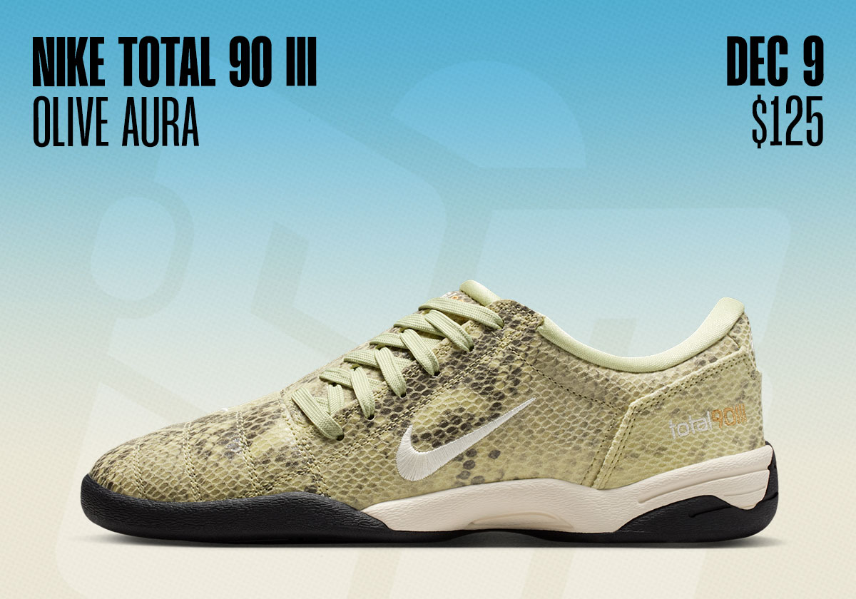 December 9th begins with Jordan Poole’s GT Cut 3 “Milk & Cookies,” another chapter in the PE-to-retail pipeline. Retro footwear then takes up the spotlight, from the first two colorways in the Nike Air Rejuven8 bring-back to another step for the Swoosh’s indoor soccer titan: the Nike Total 90 “Olive Snakeskin.”