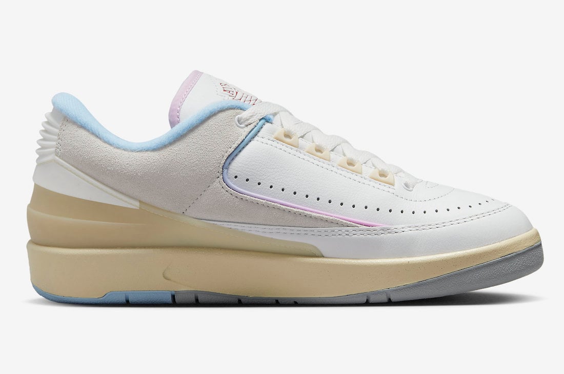 This Air Jordan 2 Low features a Summit White, Varsity Red, Ice Blue, Iced Lilac, Muslin, and Light Steel Grey color combination. The pair will feature colors from the ad campaign/poster. Constructed with leather and suede overlays, Purple lands on the pipping, Wings logo, and inside of the tongue. Other details include aged detailing and Iced Blue on the liner and hinted on the outsole.