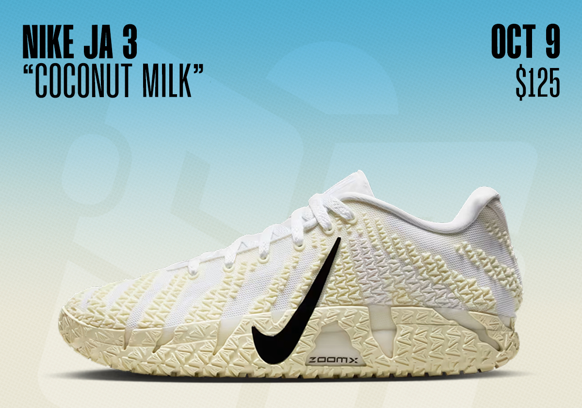 October 9th sees #12 take the spotlight via the Nike Ja 3 “Coconut Milk,” but a new step for the King comes as a close second with the Nike LeBron 23 “Miami Twice.” A collaborative chapter in formalwear x streetwear drops with the Nike x Air Afrqiue Air Max, while Flacko gets in on the action with the newest ASAP Rocky PUMA collab. Finally, more from the Jumpman’s lifestyle end: the Jordan Trunner O/S “Light Orewood Brown.”