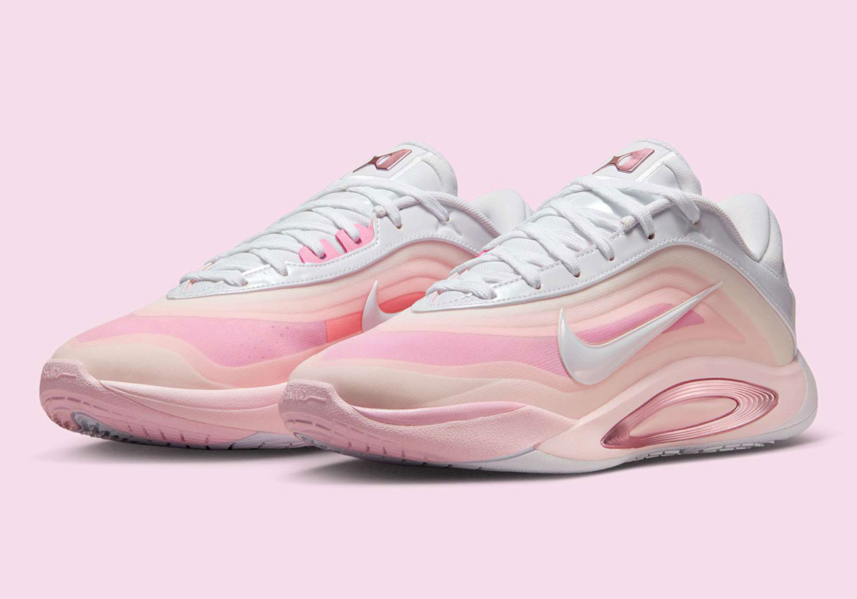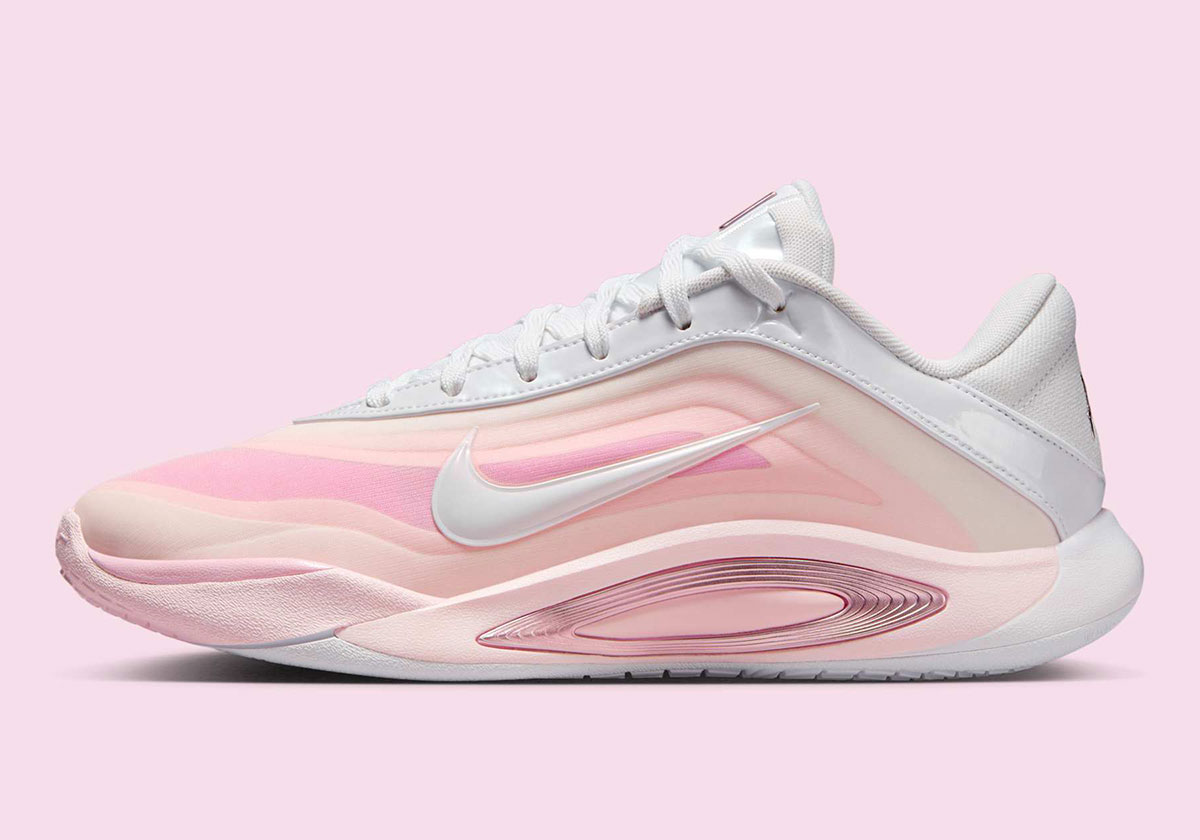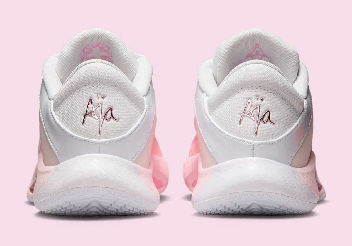 Official images reveal different shades of pink on the shoe’s pearl-inspired upper, moving from dark to light as the layers expand. White patent leather on the Swoosh logos and eyelets ties in with A’ja’s draft day shoes, complemented by metallic pink on the branded elements and lateral midsole accent.