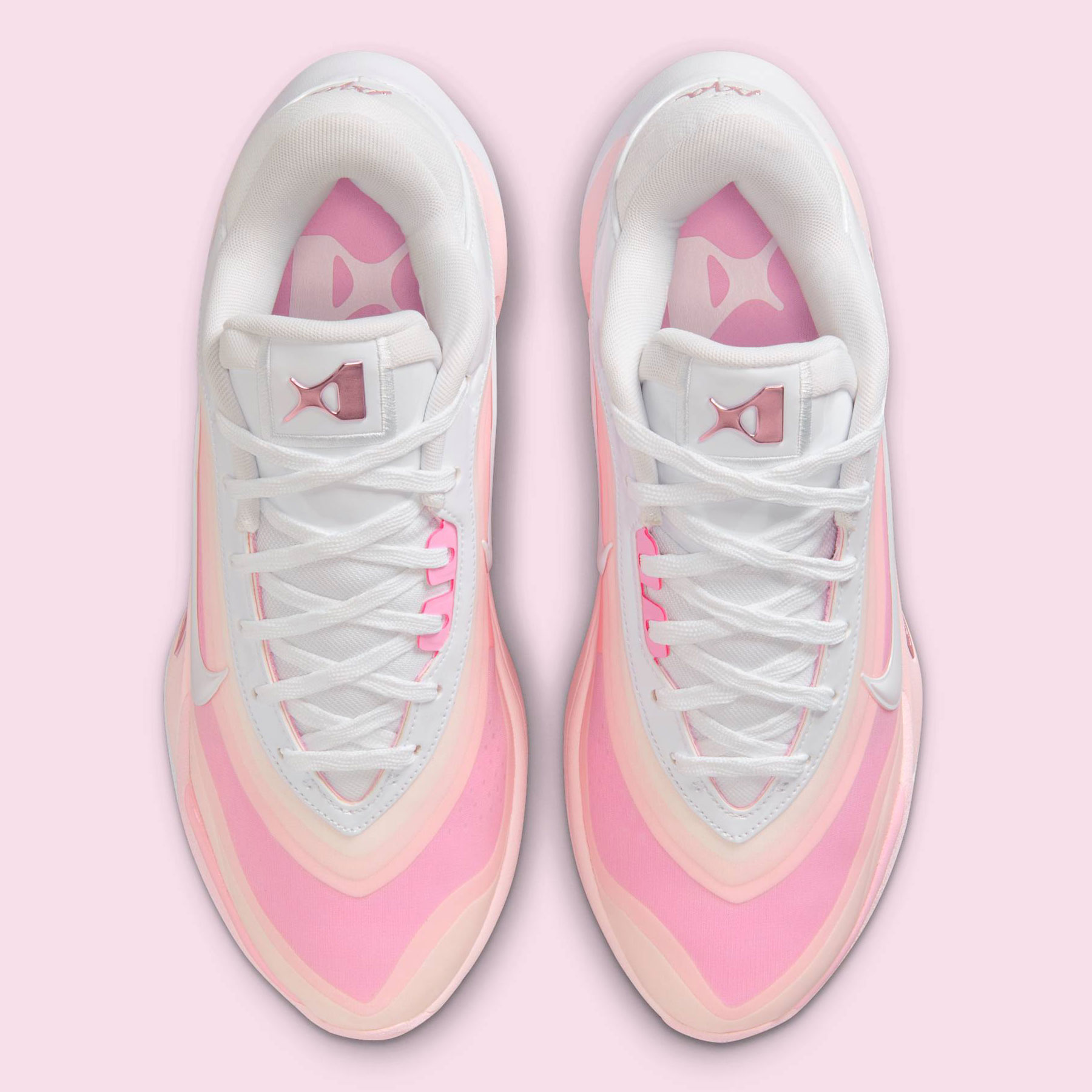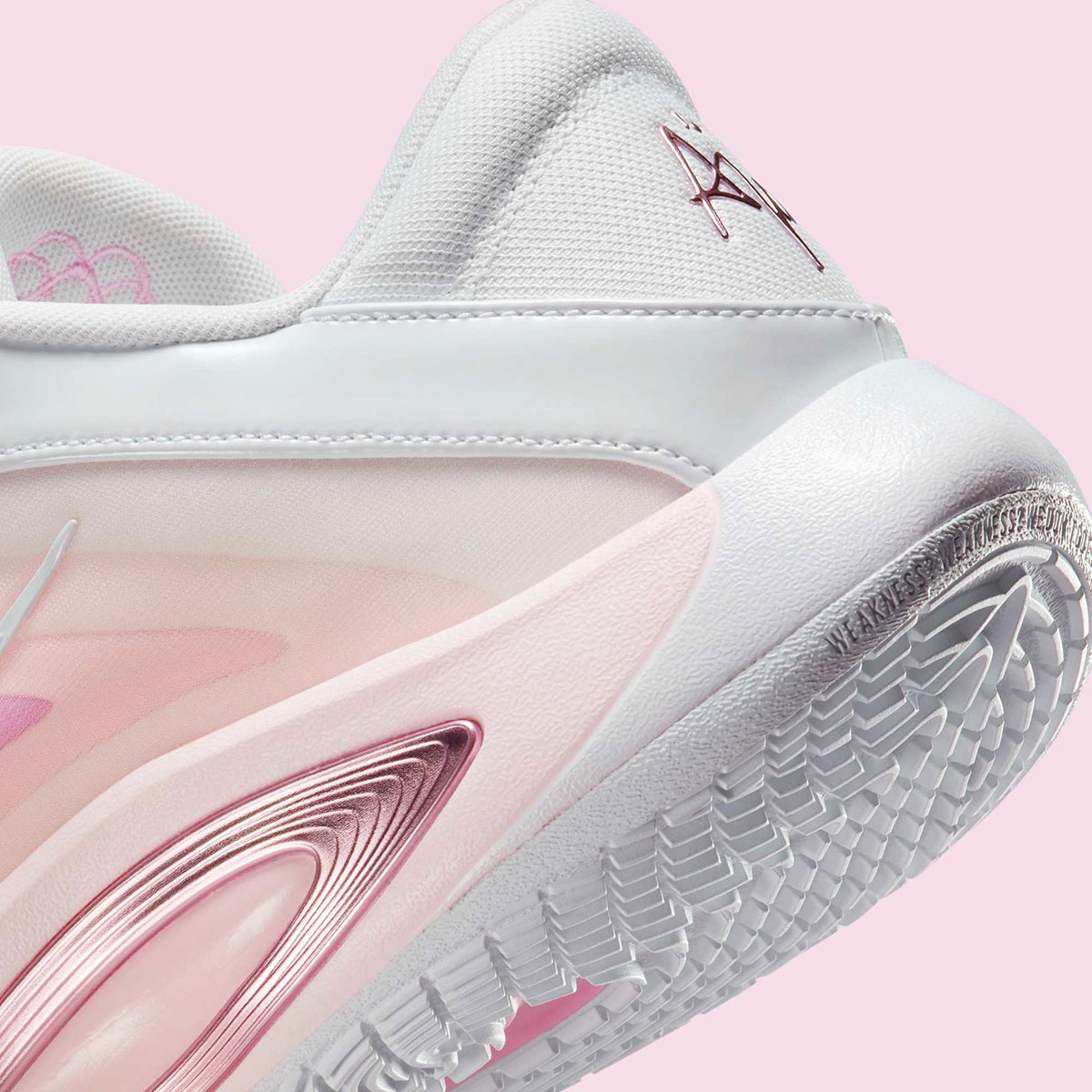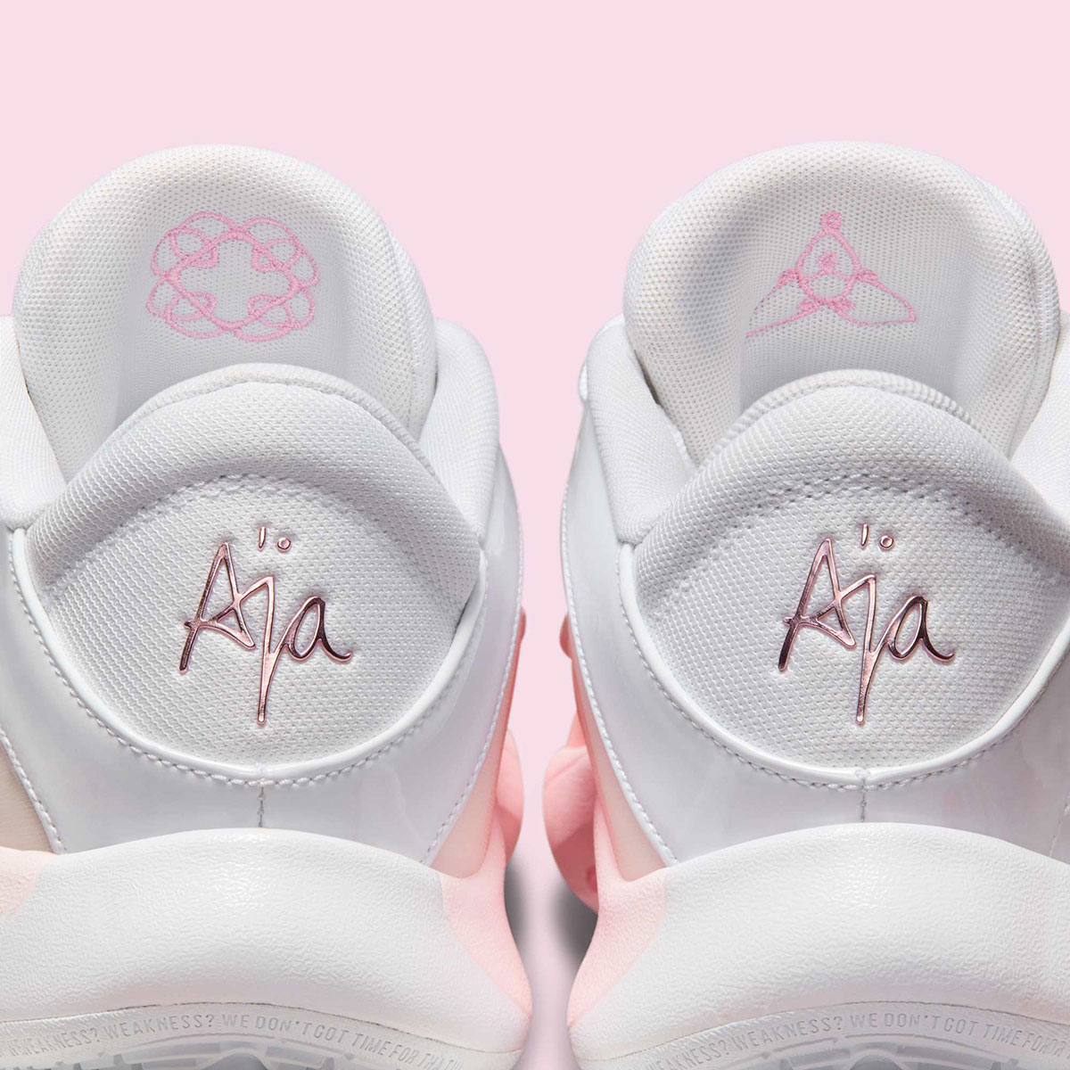 Official images reveal different shades of pink on the shoe’s pearl-inspired upper, moving from dark to light as the layers expand. White patent leather on the Swoosh logos and eyelets ties in with A’ja’s draft day shoes, complemented by metallic pink on the branded elements and lateral midsole accent.