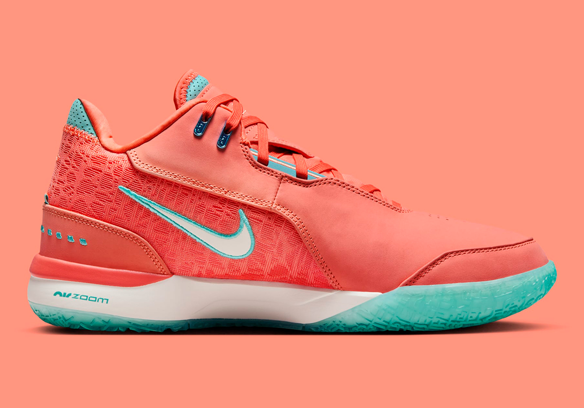 As you can tell, Nike chose to alternately block the chief colors. A bright teal-adjacent Mineral Blue appears on one shoe, while a blazing hot Light Wild Mango appears on the other. These are more aligned with the Miami Dolphins than with the teal/pink that will forever be associated with LeBron’s first and only tenure with the Heat, but the appeal of the SoFla hues is undeniable.