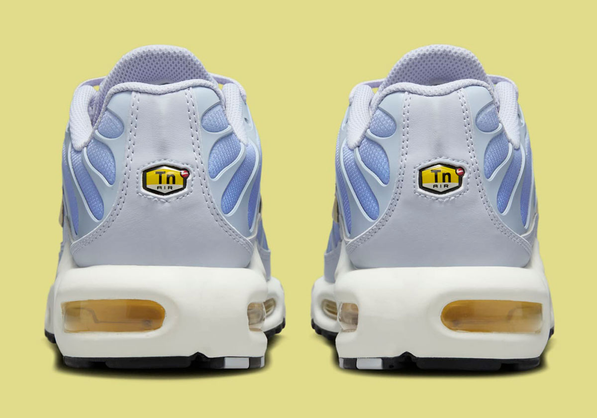 The Tn’s affinity for gradient looks is well-documented, so it’s no shock that another ombre pattern graces this look. What is unexpected is the embrace of “Dawn,” of course jumping off from the original “Sunset” Air Max Plus but instead embracing a top-of-the-morning aesthetic. To further the sprightly atmosphere, scattered notered of sunny “Light Lemon Twist” yellow overlay atop the cool lavender & light blue foundation, most striking on the underfoot visible Air. A jet black outsole anchors the design, and wrapping up the palette nicely, the TPU patch that splits the midsole sports each of the energetic shades in an abstract arrangement.