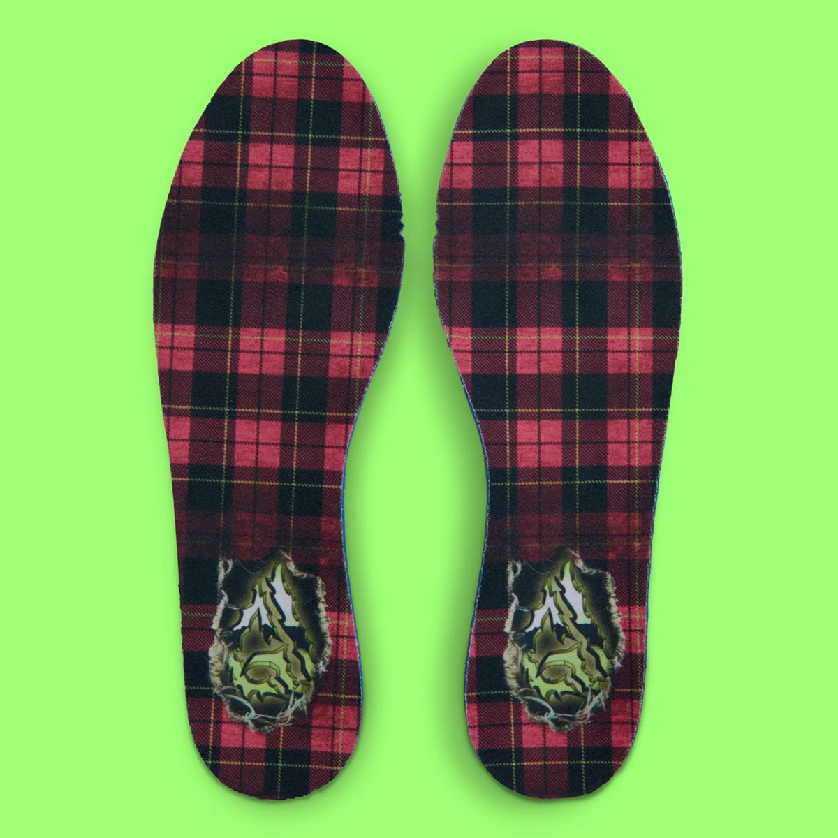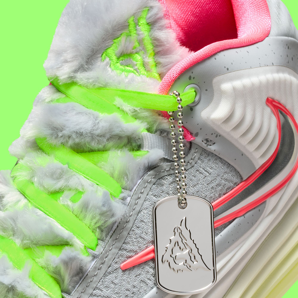 Nonetheless, that inspiration is evident from the jump with a furry grey tongue, spreading its tonality onto “Cement” outlines emanating from the collar and “Silver Bullet” Swooshes. Finishing with rosy pink outsoles and neon green laces, we’re left to wonder if this is a dual holiday edition, tacitly functioning as a Christmas-ready pair on top of its spooky season overtones. Look to the insoles if you have doubts, where flannel patterning underlines a ghoulish overhaul of the GA logo.
