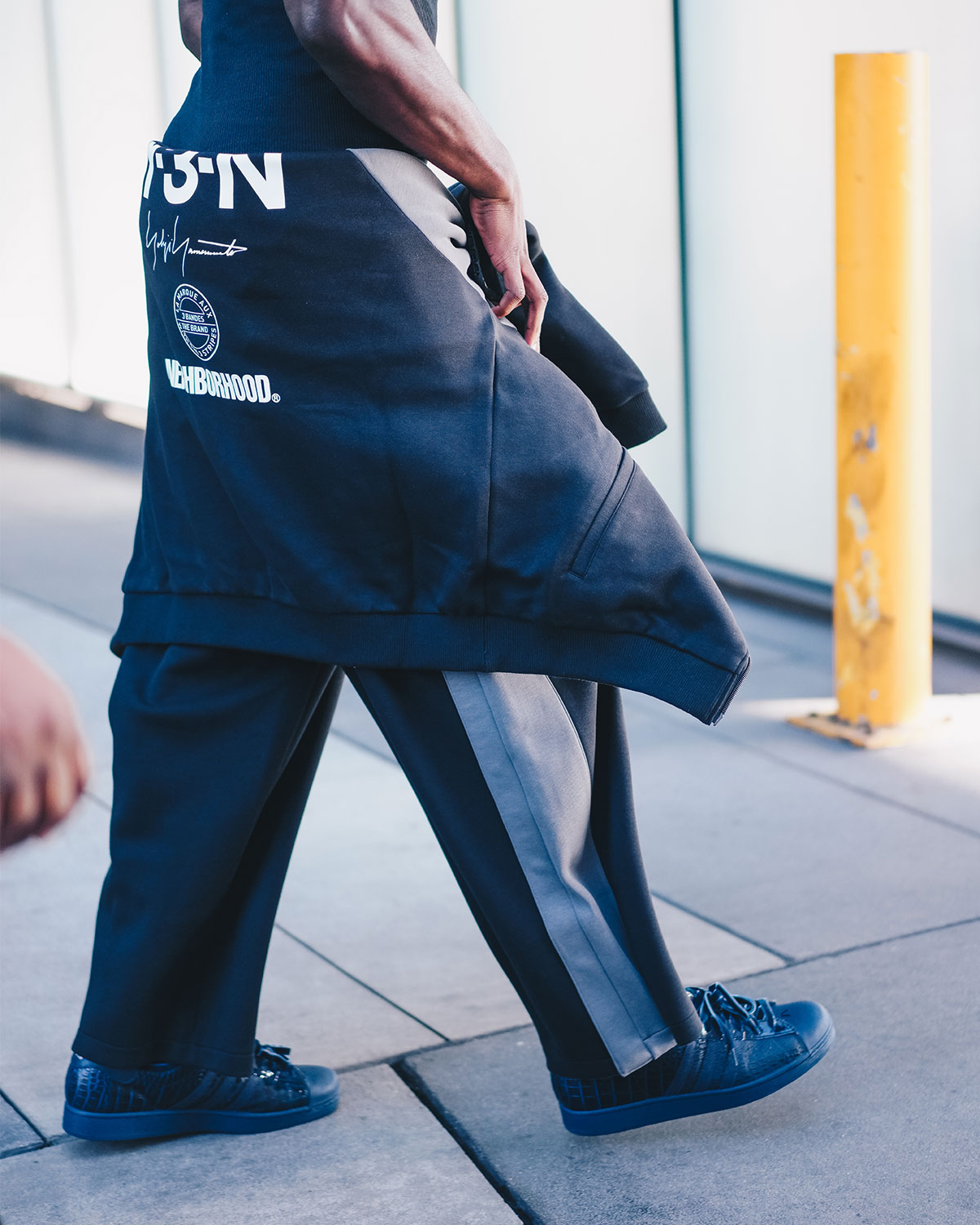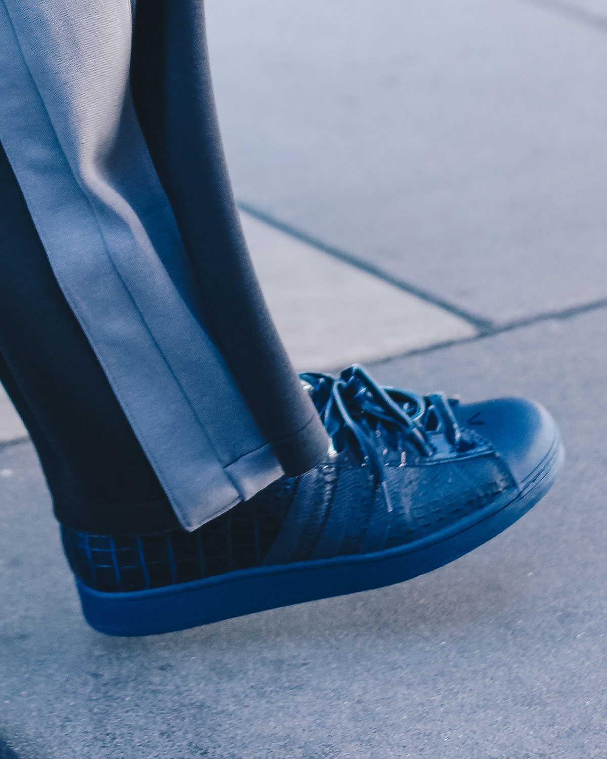 This first look spotted on Ant-man’s feet reveals a monochromatic navy blue execution topped with a exotic croc skin finish across the entirety of the upper. Thicker, velvet shoe-laces continues the elegant nature of the silhouette to purvey that luxury hand-bag aesthetic, while his apex logo is seen etched at the base of the laces a-top the signature shell-toe design.