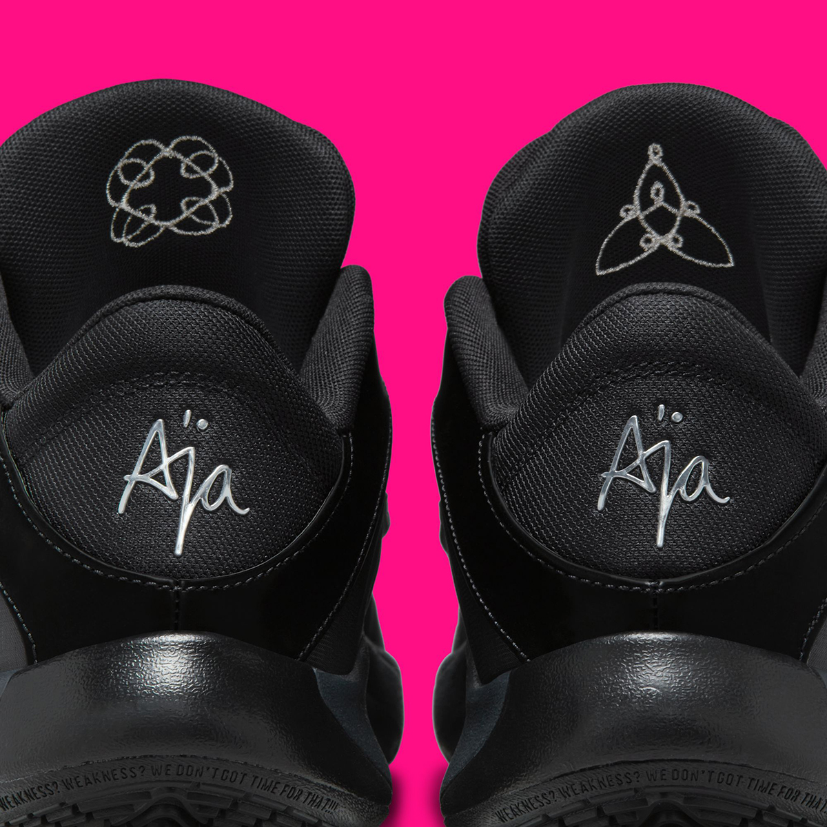 Here we have the essential “team colorway” that typically follows the debut of signature models – granted, it’s not as immediately distinguishable as those from players repping teams with more vibrant uniforms. This Nike A’One here matches the Las Vegas Aces’ kits with a low-key “Black/Dark Smoke Grey/Light Smoke Grey” foundation, directing all attention toward “Metallic Silver” accents on the Swoosh logos, midsole detailing, and branded elements. Notably, while many Nike A’Ones emphasize the model’s pearl-inspired upper through a color gradient, this pair opts for a uniform “Dark Smoke Grey” base. Glossy black leather runs from the eyelets to the heel, wrapping around the back, while A’ja’s two signature logos appear on the tongue and heel. On the inner tongue are Celtic symbols replicating her tattoos that honor her parents, Roscoe and Eva Wilson.