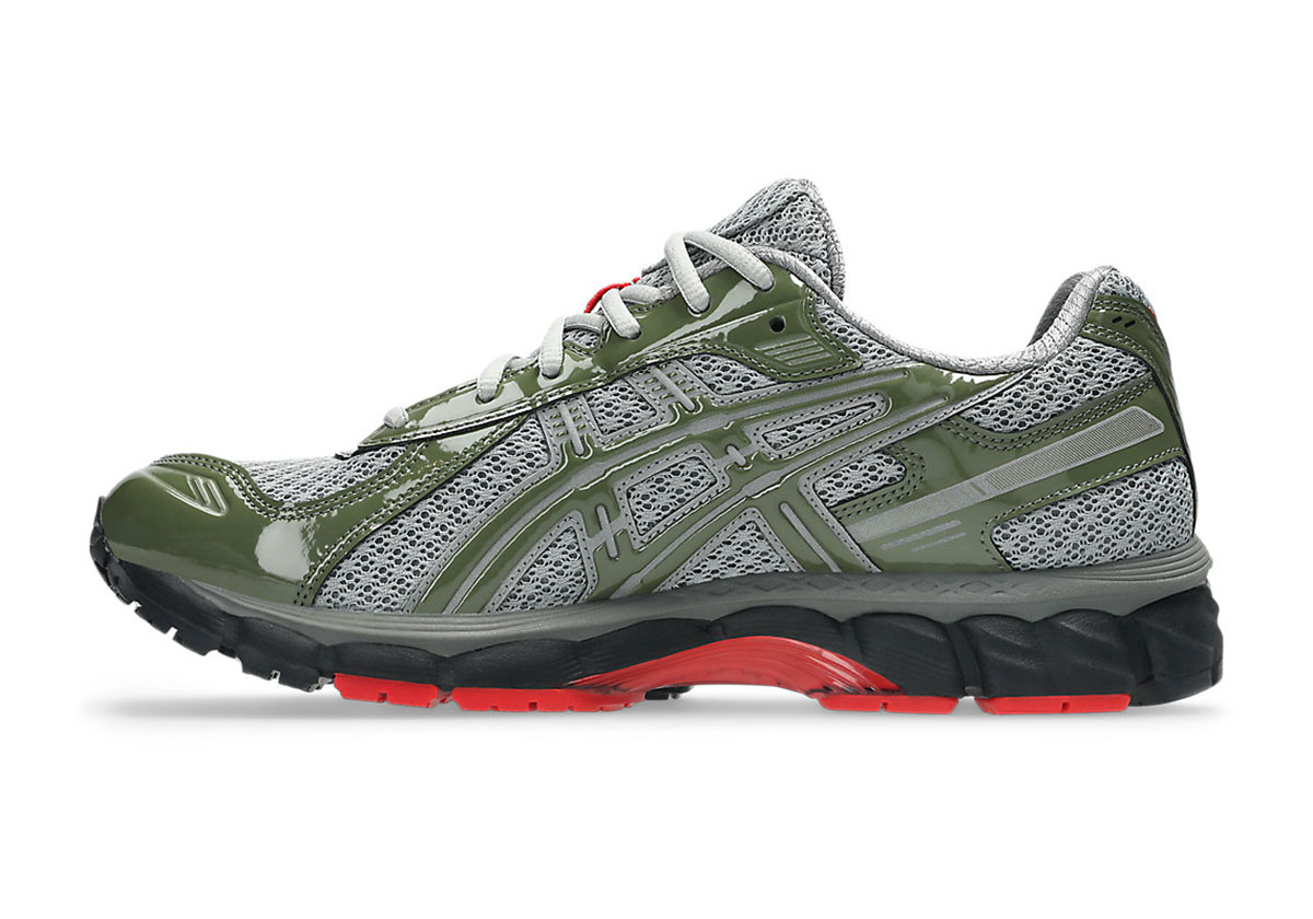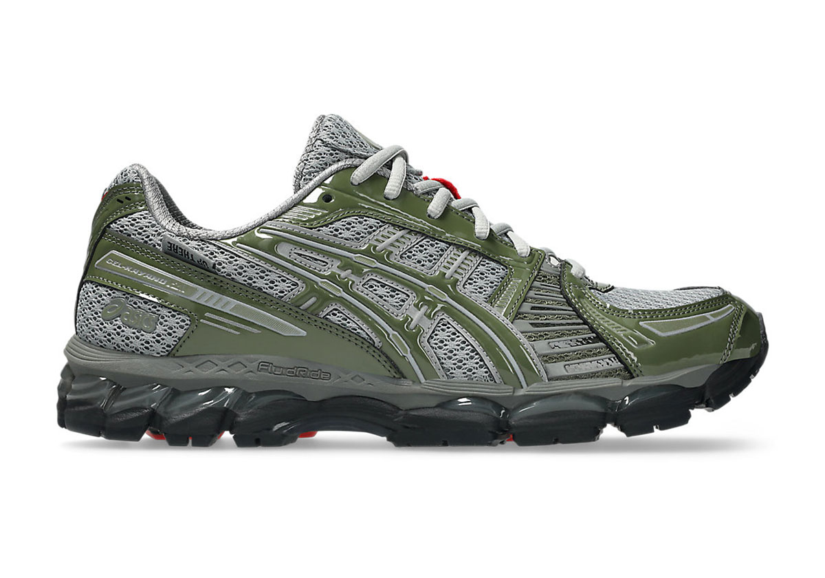 The news of this collab pair comes as Up There states down fifteen years of business, something they’ve taken to their social media channels to tease and commemorate in recent weeks. Perhaps this ASICS edition was plotted as a part of a birthday surprise for their fans — and in that case, we’re sorry for spoiling — but you wouldn’t garner that from the official image suite that’s hit the ASICS server. Indeed, outside of a tag towards the rear and co-branded insoles, there are few ties to the Up There name in general. They instead focus their energy on elevating a largely neutrally shaded do-up of the GEL-Kayano 12.1, primarily achieving that with olive patent leather, a strong contrast to the steely circular mesh a layer below.