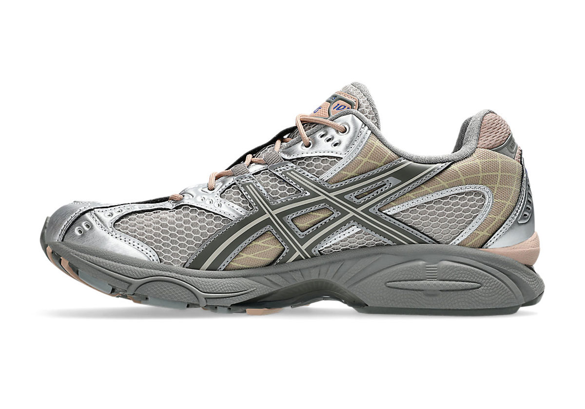 The GEL-Nimbus 10.1 isn’t a trail runner, but it’s got a few notable qualities that produce a bit of an outdoorsy vibe – namely diagonal eyelets, rope laces, and an abstract mender over the sides. The earthy “Moonrock/Truffle Grey” colorway shown here amplifies a trail shoe aesthetic even further. Metallic silver overlays loom over the tongue and forefoot, giving way to “Truffle Grey” leather sidewalls. The meander section appears in the “Moonrock” shade, complemented by soft pink hits on the tongue tag, backtab, and laces. Underfoot, the hybrid model’s GEL-Kayano 14 sole balances between “Truffle Grey” and the previously mentioned pink shade.