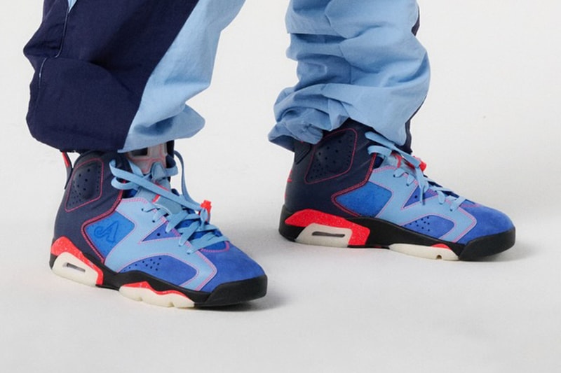 A first look at the Awake NY x Air Jordan 6 in "Midnight Navy" was offered by the label today. Following its Air Jordan 5 campaign last year, the crew has moved on to another shoe celebrating its 35th anniversary. Several blue hues are joined by "Infrared" accents, while the midfoot offers Awake's "A" motif. A "Playful Pink" rendition of the shoe is expected to drop as well.