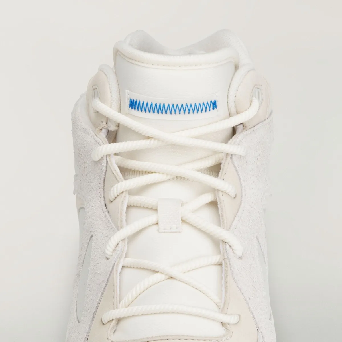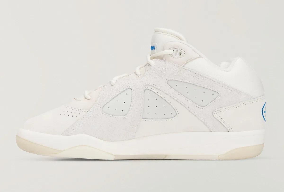 The debut signature is currently known as the BadBo 1.0. signaling their intent to continue to iterate on the shoe in the future. The shoe has been in several sneak peeks so far this year, appearing on Benito’s feet in music videos, performances, and teased behind a frosted glass panel at their Archive event in PR this Summer. This week, we have our first in-hand look at the silhouette, along with close-up photos from his SNL performance over the weekend. While nothing is currently known about any technology inside, the shoe features a mixed construction of a leather base and suede overlays. The model is a mid cut shape, and the heel construction features a double-layered design akin to adidas’ ‘burrito’ tongue from the EQT family. Seen here in the “Resilience” color scheme, the look mixes chalk, talc, and core shades of white.