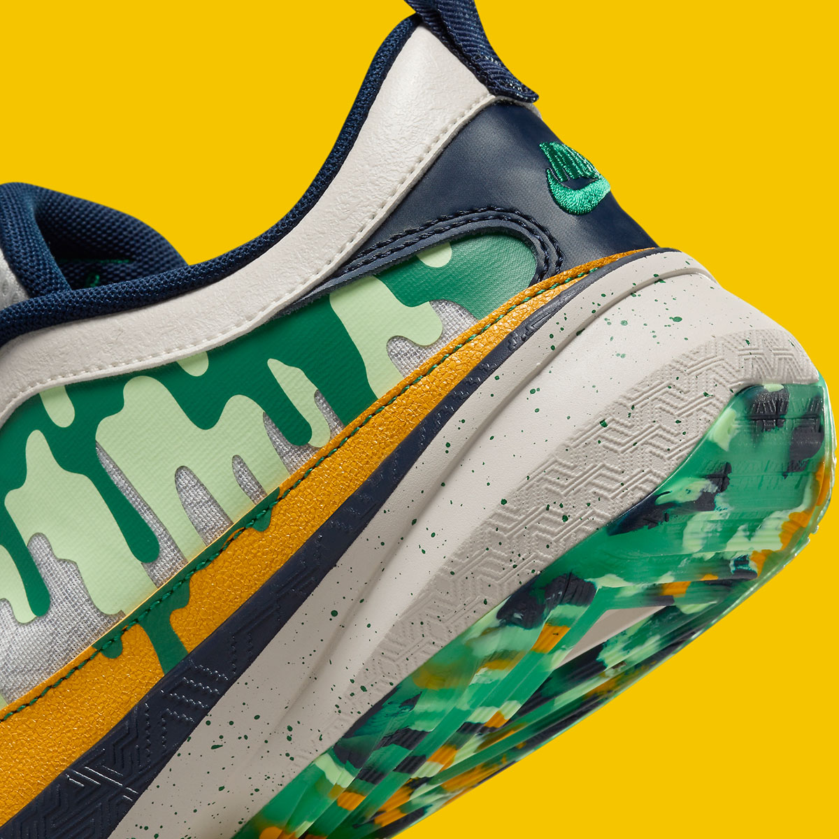Taken alongside the also included Nike Ja 1 and Nike LeBron 21 releases, this pair very much stands out from the rest. While those former two embrace the vibrant side of the season, the Nike Zoom Freak 5 instead heads into the wilderness with its viridescent camouflage. An orange Swoosh is partially covered by that liquid pattern, dripping down as it leaks from under the platinum leather up top. Underfoot, all of those shades reappear, with the combination there recalling the indelible “Undefeated” palette. On theme, that camo also evokes hunting gear in its hi-vis orange accents. One final detail hammers home this pair’s “limited edition nature,” with a special “GA34” branded hang-tag dangling from the laces in near dog tag fashion.