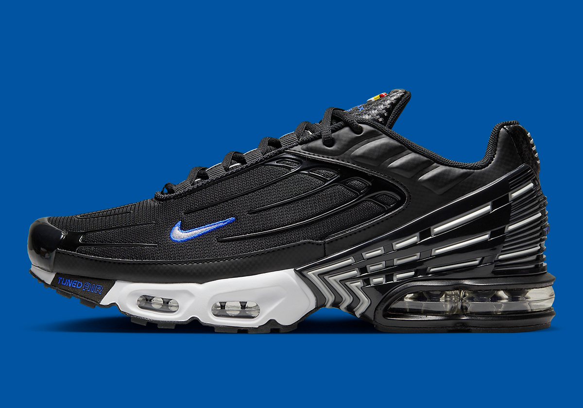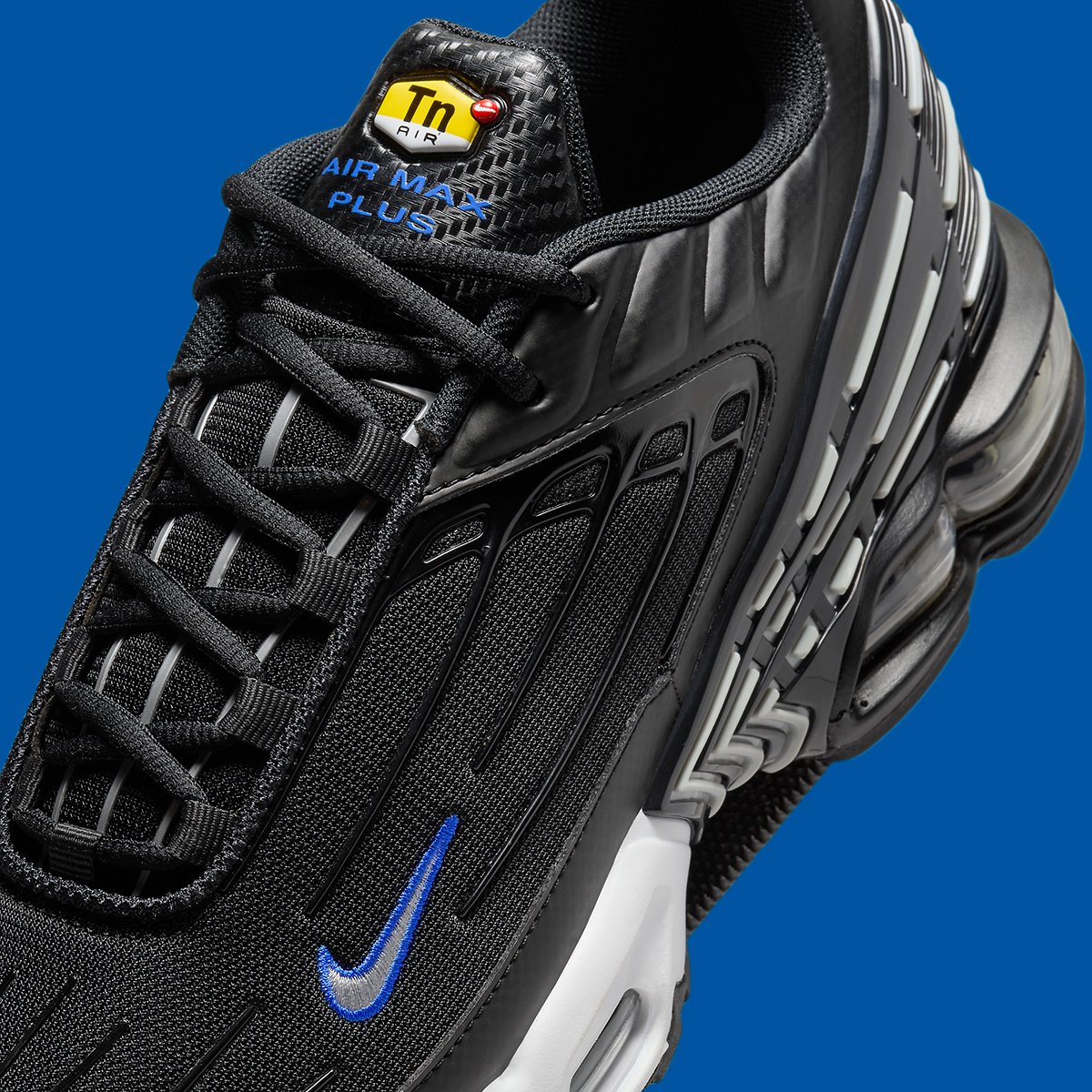 The standout feature on this pair is the carbon fiber texture on the tongue and heel, a detail that aligns well with the techwear-adjacent style of the Air Max Plus 3. The pattern then makes its way onto the quarter panel and mudguard, where the black leather is treated with subtle checkering. While the rest of the upper dresses in a familiar black mesh, royal blue accents serve to add a splash of color while fitting the overall theme on this pair.