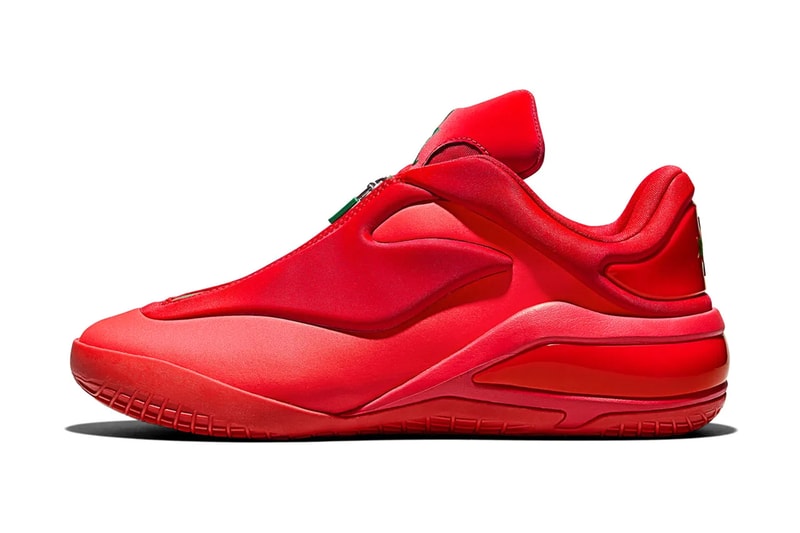 Despite its vibrant color scheme, the "Winter Red" silhouette aligns with Shai's preference for minimalism, similar to previous monochromatic releases. It features a bright red tone contrasted with pine green accents. The shoe maintains its signature elements, including the sleek zipper shroud, sculpted sidewalls, and smooth, neoprene-like upper, all in bright red. Pine green details are strategically placed on the zipper track, tongue logo, and outsole, giving it a seasonal feel without an overly fancy design.