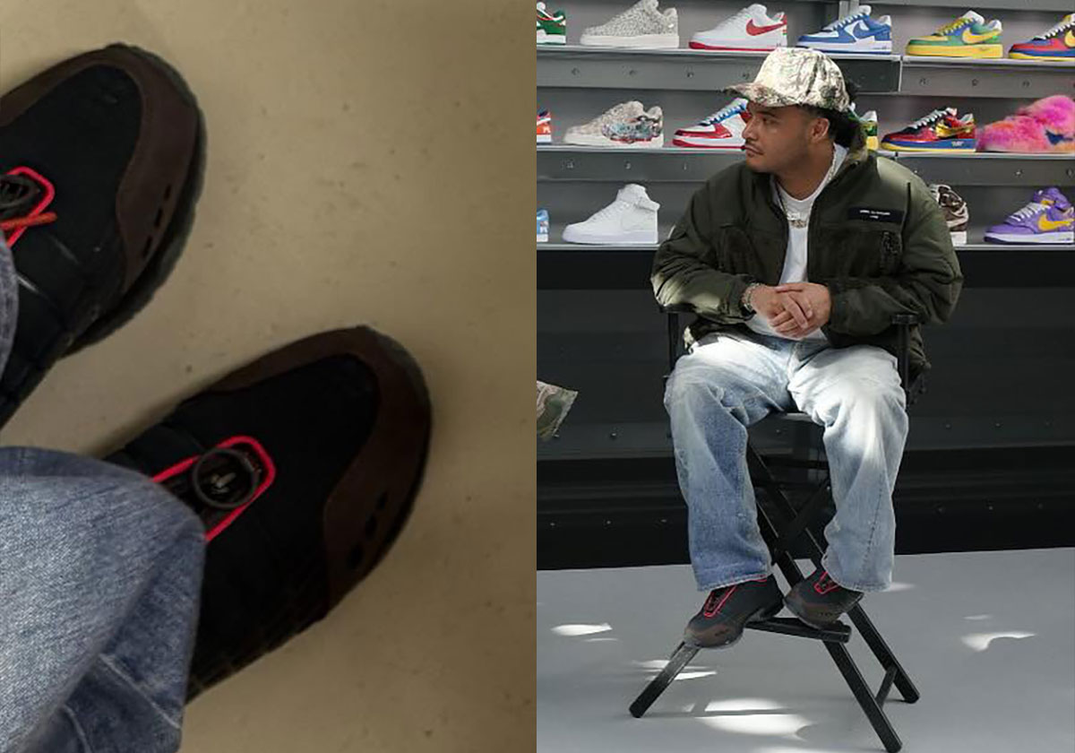 An all-too-common issue in parsing these sorts of teaser shots, the label founder’s widened outfit choice makes decoding the shoe’s overall appearance that one step harder. However, a top-down image confirms the straightened synthetic overlays on the sidewalls, harkening to the globes on phone cards of the 2000s, likely indicating that the main innovation is the color choice. There, it’s a significant step away from the vibrant fare of the three variations seen so far, leaning on the “Bred” aesthetics that’ve served the Swoosh empire well for decades.