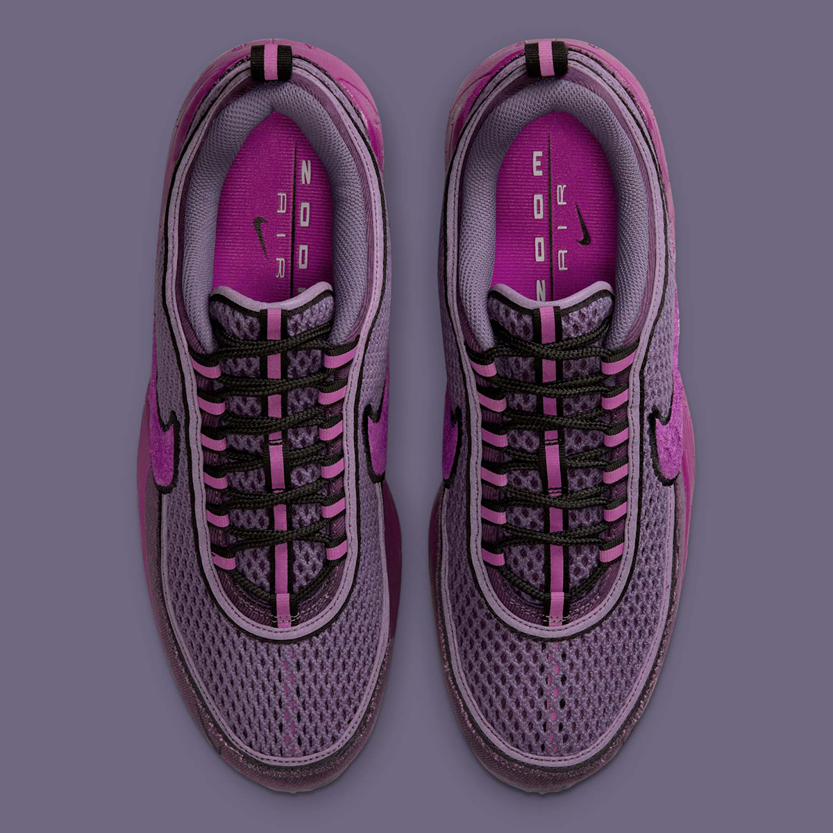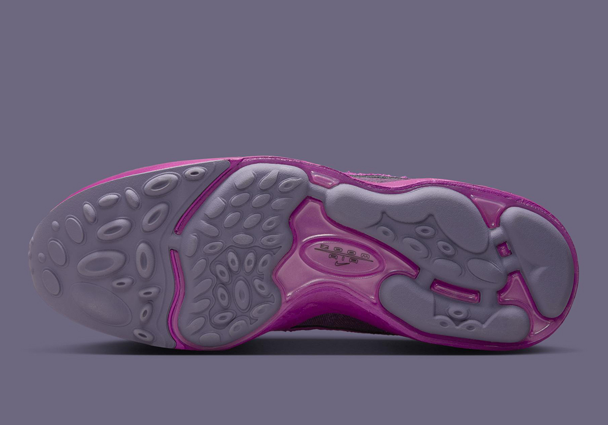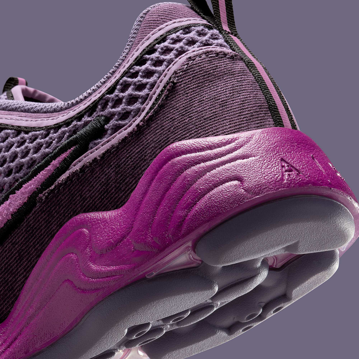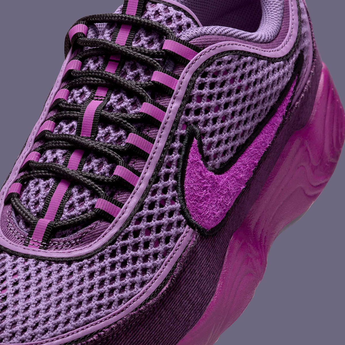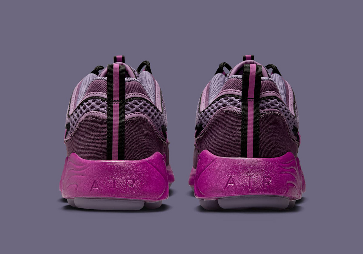 Three key hardware changes take place, led by denim as opposed to synthetic material on the mudguard portion. Moving upward, you’ll notice the sneaker uses a more open, airy mesh fabric across the base and tongue. Lastly, the Swoosh logos drop their usual metallic finish in favor of hairy suede. All those texture swaps are married with a palette of “Hot Fuchsia/Black/Canyon Purple/Viotech,” producing a truly eye-catching pair that comes packed with energy. It’s not necessarily as Y2K-like as most Spiridons, but still manages to capture a certain retro essence.