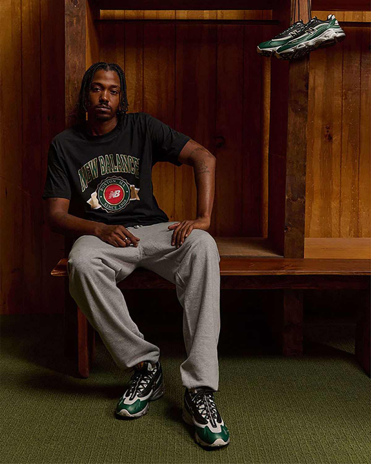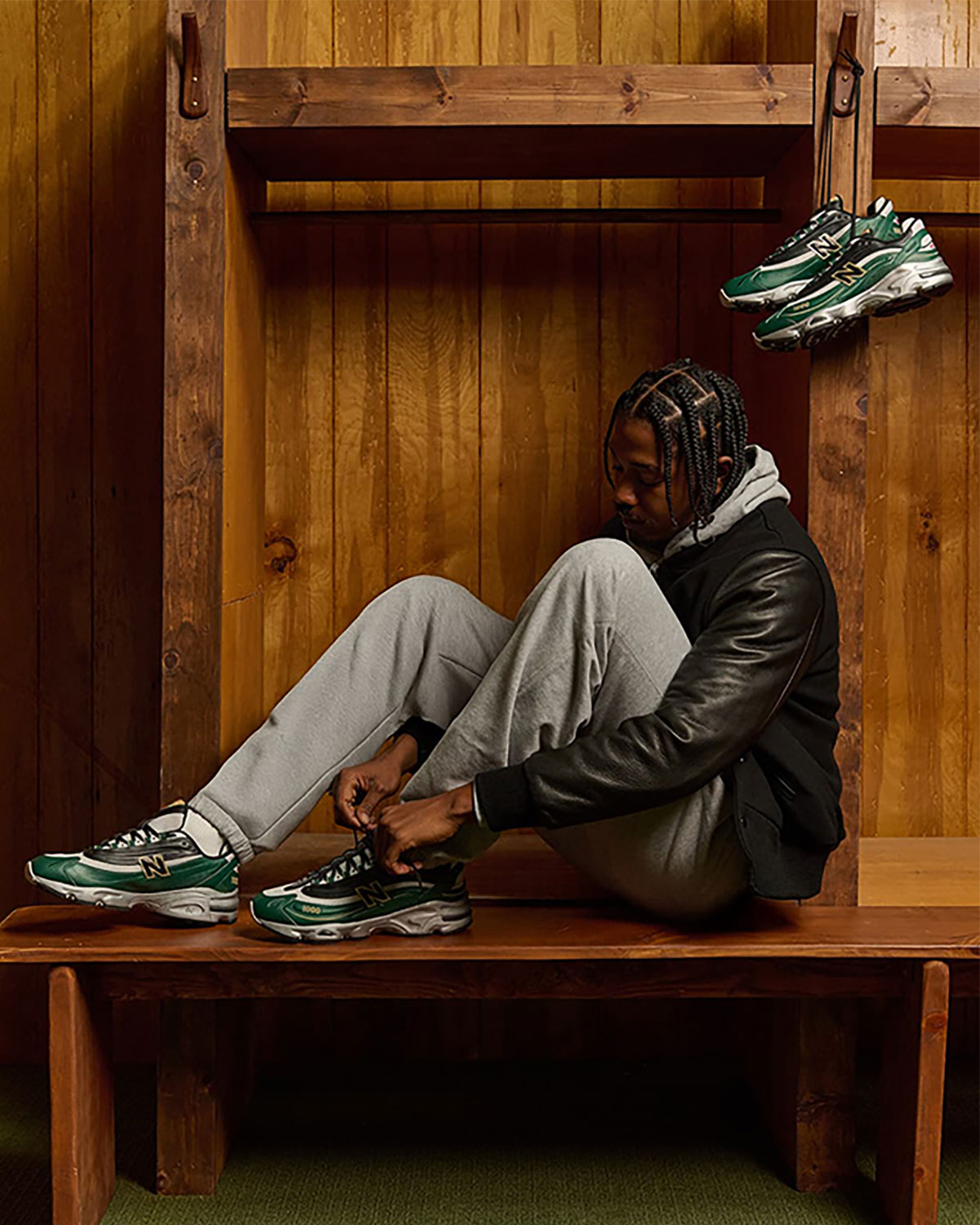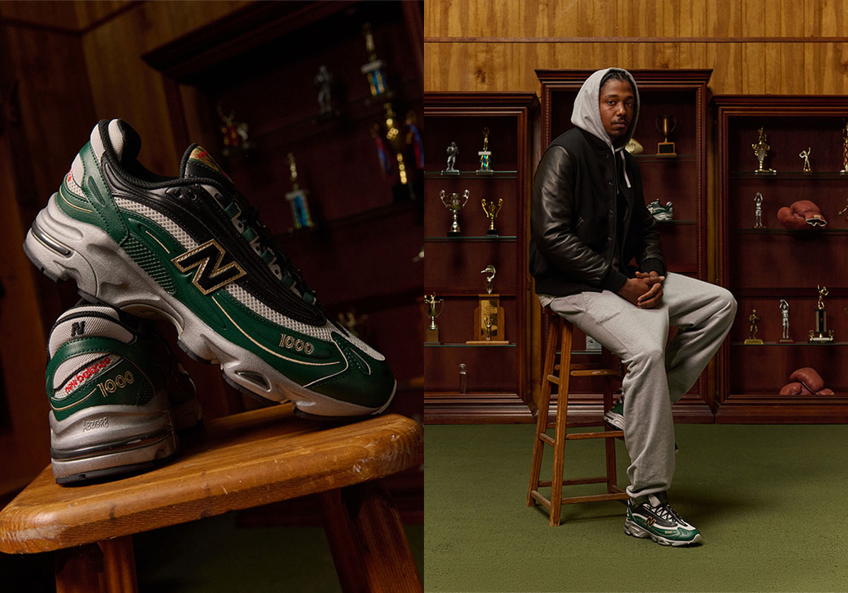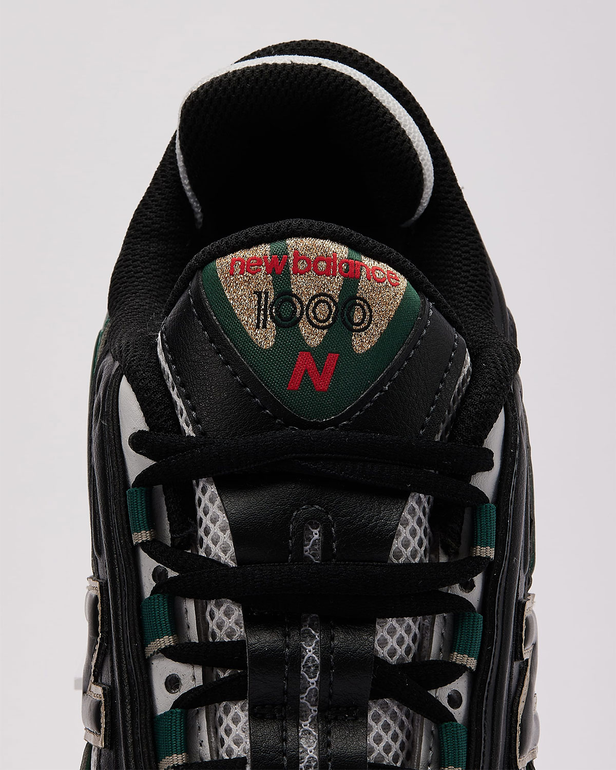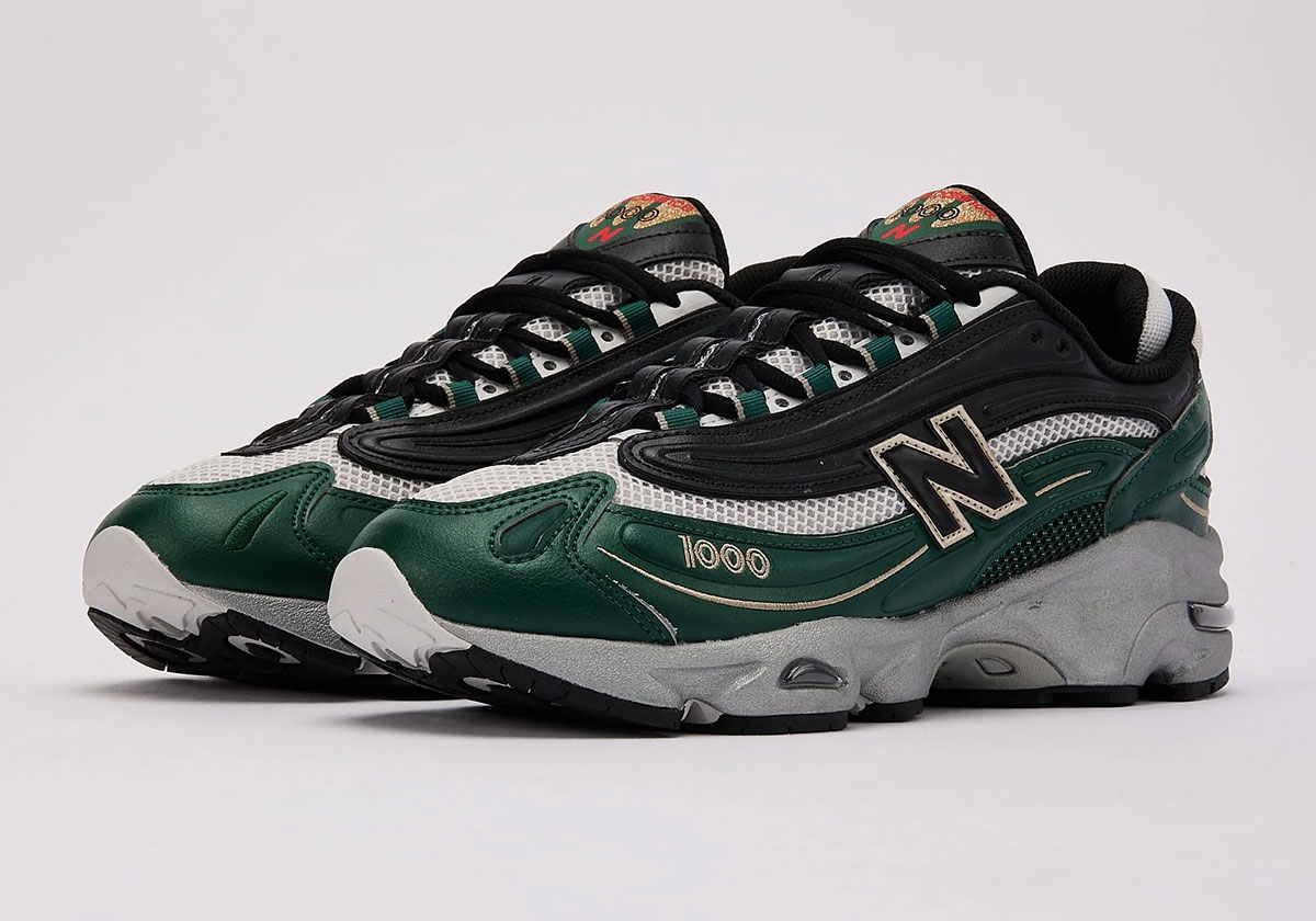 As for the sneaker itself, the New Balance 1000 takes on a celebratory, almost regal aesthetic with green leather and gold detailing. The uppermost leather placement comes in black, while white mesh provides contrast one layer down. All told, it’s a design that feels both meaningful and wearable.