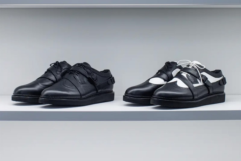 Built upon the foundational silhouette of a classic wingtip shoe, the design incorporates a modern arrangement focused on everyday functionality. Bypassing traditional lacing systems, the collaborative model utilizes an adjustable belt strap, allowing for quick slip-on capability and a customizable fit.