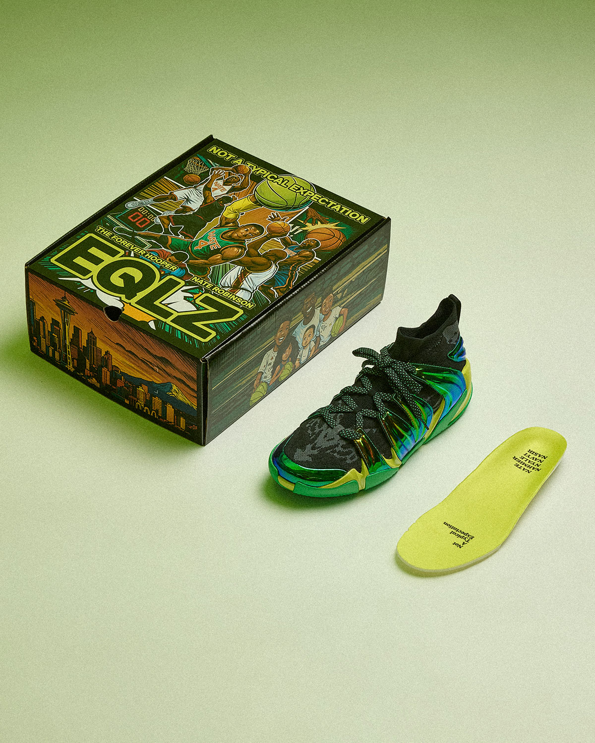 A series of illustrations document Robinson’s professional and personal journey, including odes to his Seattle roots, unexpected foray into boxing, and life-changing kidney transplant. Shane Cleveland, a native of the Seattle area who stepped forward with a miraculous gift of a kidney donor, is featured on the actual shoe-box, with his name printed on the insole. Below, Nate gifts Shane a pair of the EQLZ footwear – one of their many meet-ups since the procedure earlier this year.
