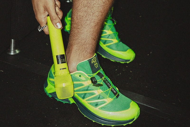 Feid x Salomon's XT-Pathway silhouette comes similarly doused in different shades of green, with a forest green midsole complementing the lime green accenting throughout the shoe.