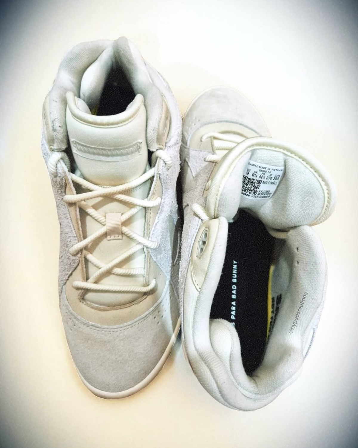 As @hypedsolutions points out (the source for these in-hand shots), traditional Three Stripes branding is absent for this new silhouette, but there are still ties back to the broader adidas Bad Bunny catalog, including with the stitched detail on the tongue that fans will recognize from his work on the adidas Gazelle. The ridged rope laces utilized in this sample white/grey colorway accomplish the same. This hoops-adjacent silhouette closes with a wavy sole design, Trefoil hit on the interior bootie, and a asymmetric heel structure.
