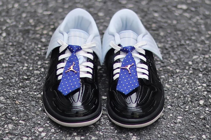 Name: Air Jordan 1 Low Method of Make v3 “Suit and Tie”SKU: TBCRelease Date: 2026The Air Jordan 1 Low Method of Make v3 “Suit and Tie” offers a playful twist on formalwear, transforming the classic basketball silhouette into a literal dress‑up sneaker with shirt‑collar details, pinstripes and polished finishes.The design is anchored by a glossy black upper, adorned with a light blue, folded pinstriped shirt collar that literally replaces the traditional tongue and ankle collar. The center of the "tongue" is even finished with an integrated button. This is topped with a polka dot lace clip that mimics a tie, while a gilded Jumpman brooch adds a touch of luxury.First look images of the shoe have been teased by @gc911 on Instagram, with not formal release information available at the time of writing.Click here to view full gallery at Hypebeast