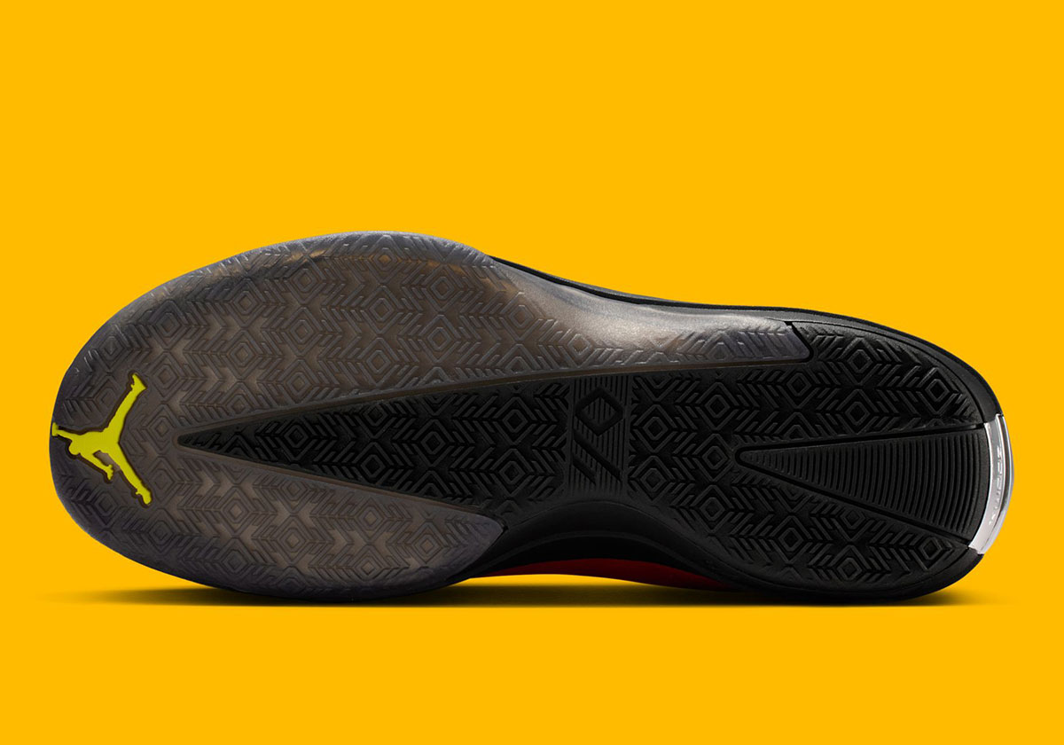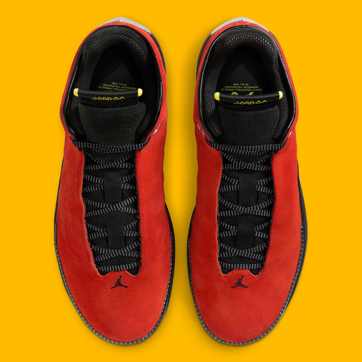 Official images of this pairing has revealed a strong execution. On the upper is a stitch-less suede upper in bold red, mimicking the iconic “Ferrari” colorway of the Air Jordan 14. Towards the ankle is the car badge in bright yellow embedded inside the suede upper, while the tongue features the horizontal bar that gives structure. The carbon fiber overlay is found around the toe lip, creating a sporty chassis.