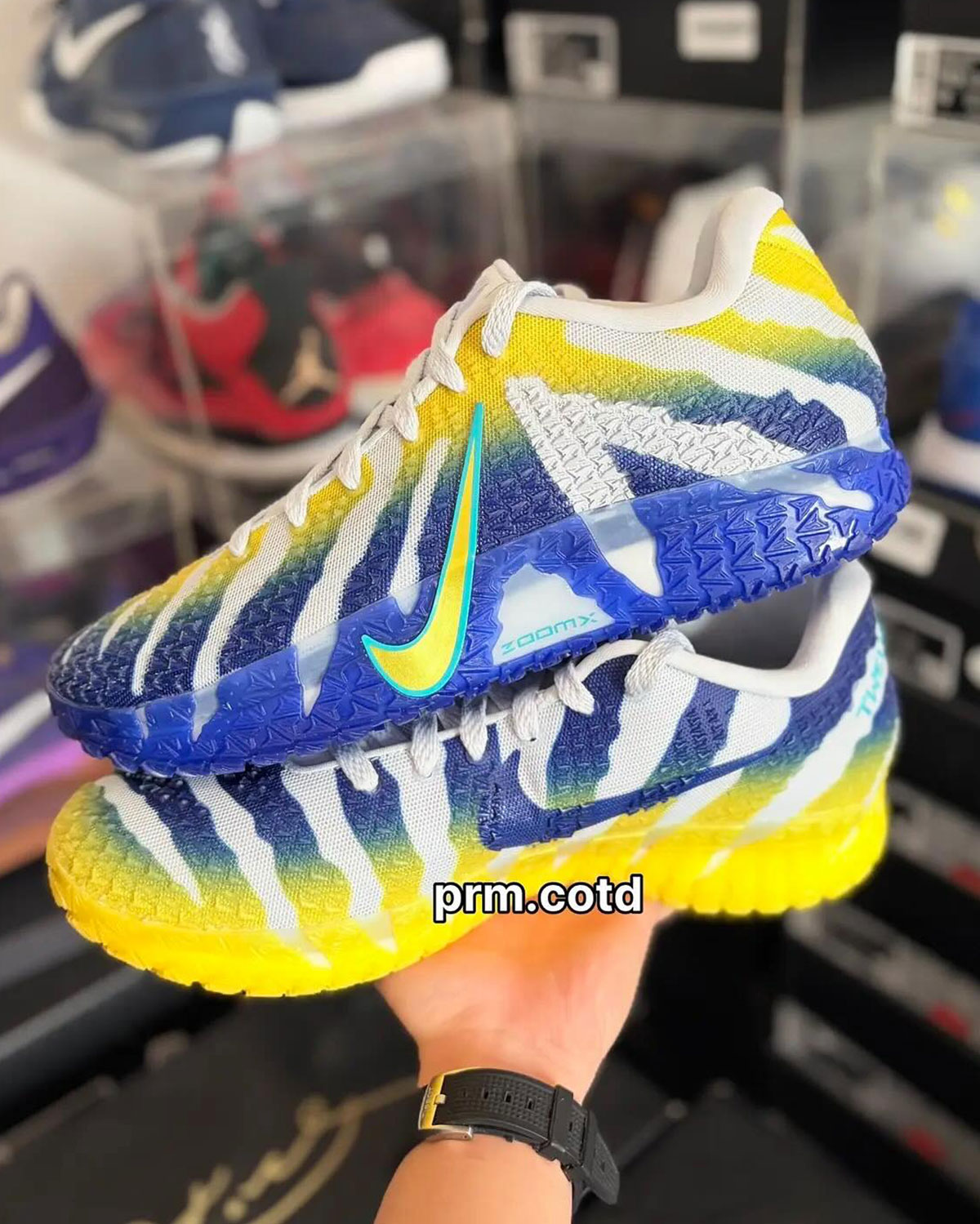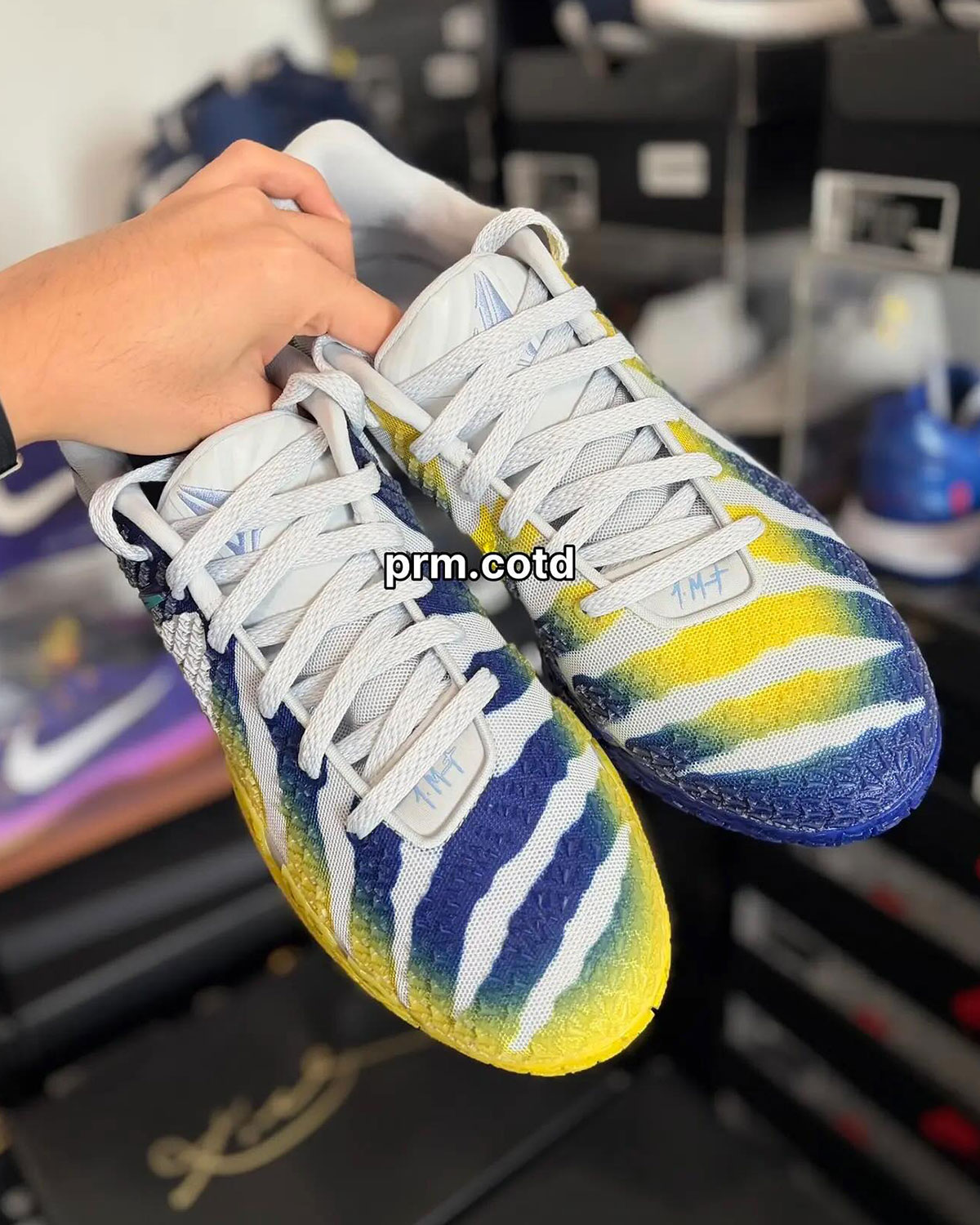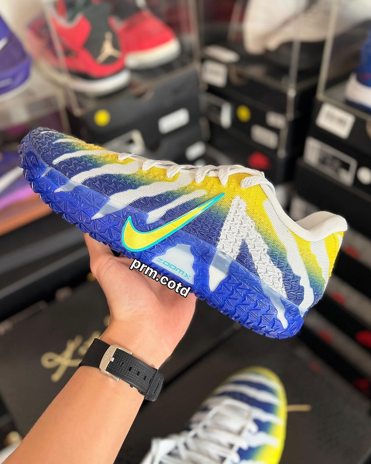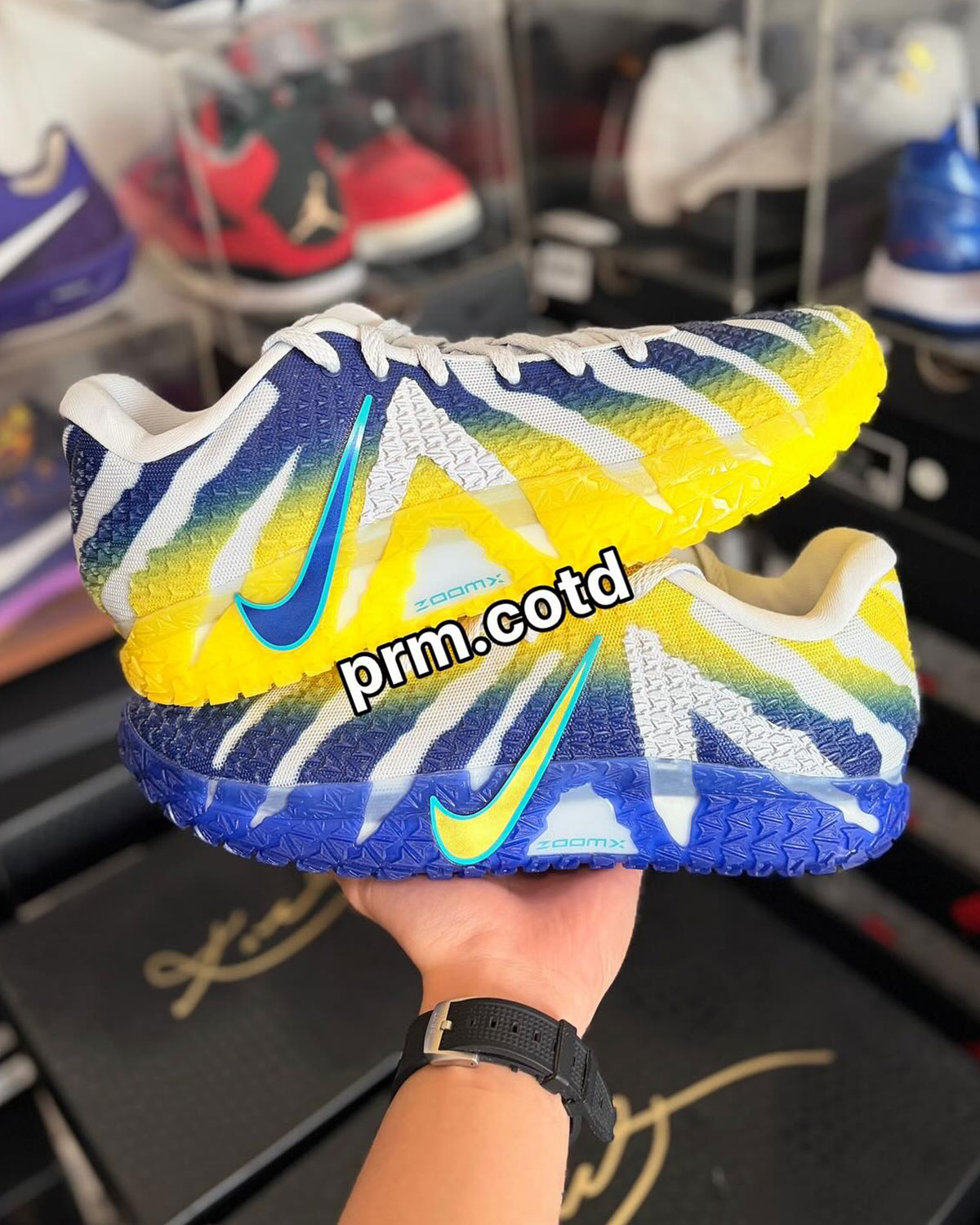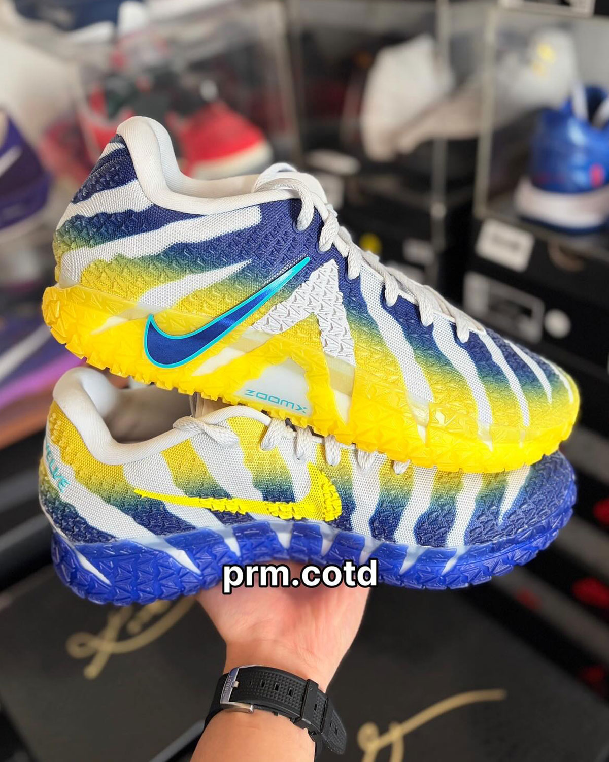 However, the celebrated design of the Ja 3 once again proves its worth in this arrangement, adding high-octane energy to the mismatch gradient layout. The school’s blue and yellow reverse from left shoe to right shoe, further alternating the Swoosh for one all-blue and one Sprite-like lime/cerulean. White mesh underpinnings unite both, as does a paler Ja logo on the tongue.