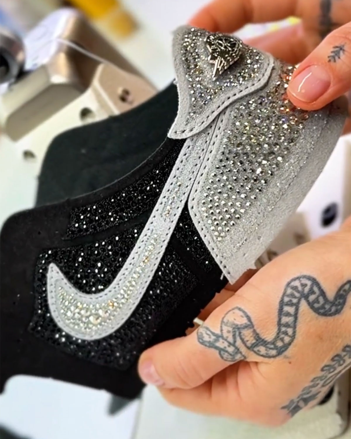 Priced at $1,000, this Air Jordan 1 Low leaves no surface uncovered as the precious crystals engulf the entirety of the upper — even the tongue. Leather tongue labels with the classic Nike Air are paired up with a solid silver traditional Wings pieces on the heel. Most important, this Swarovski Air Jordan 1 Low reveals the updated shape of the low-top ’85 model, showcasing a more accurate Swoosh logo shape.