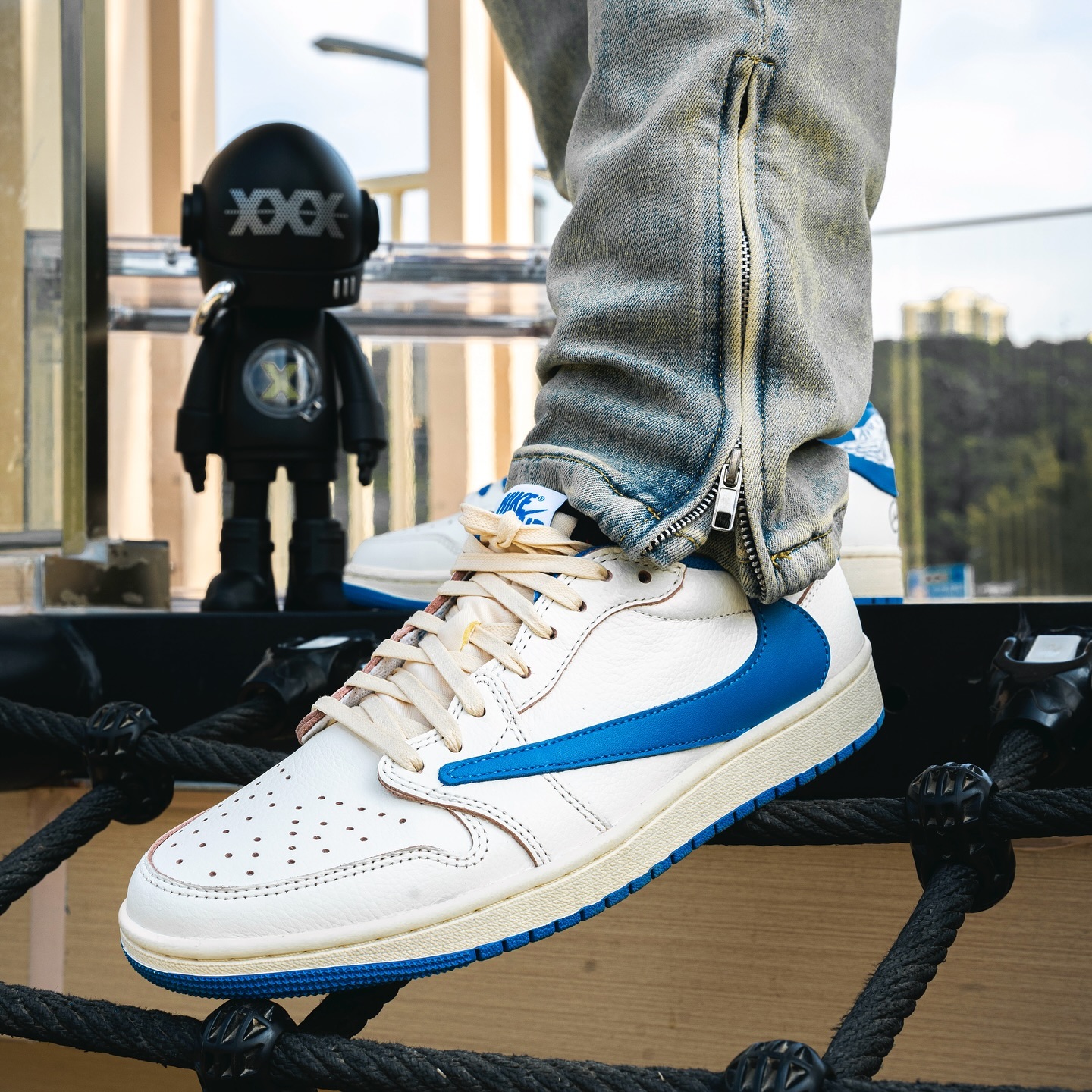 The gallery below shows a design consistent with what’s been previewed thus far. The shoe features a white leather upper, save only for Fragment’s hallmark “Military Blue” shade on the reverse Swoosh and backtab. The tongue and midsole deliver a neo-vintage edge in “Sail,” enhanced by chalked edges throughout the top half. The Wings logo is stitched onto the backtab in white, subtle black text dots the medial side of the midsole, and Cactus Jack/Fragment logos appear on the left and right heels, respectively.