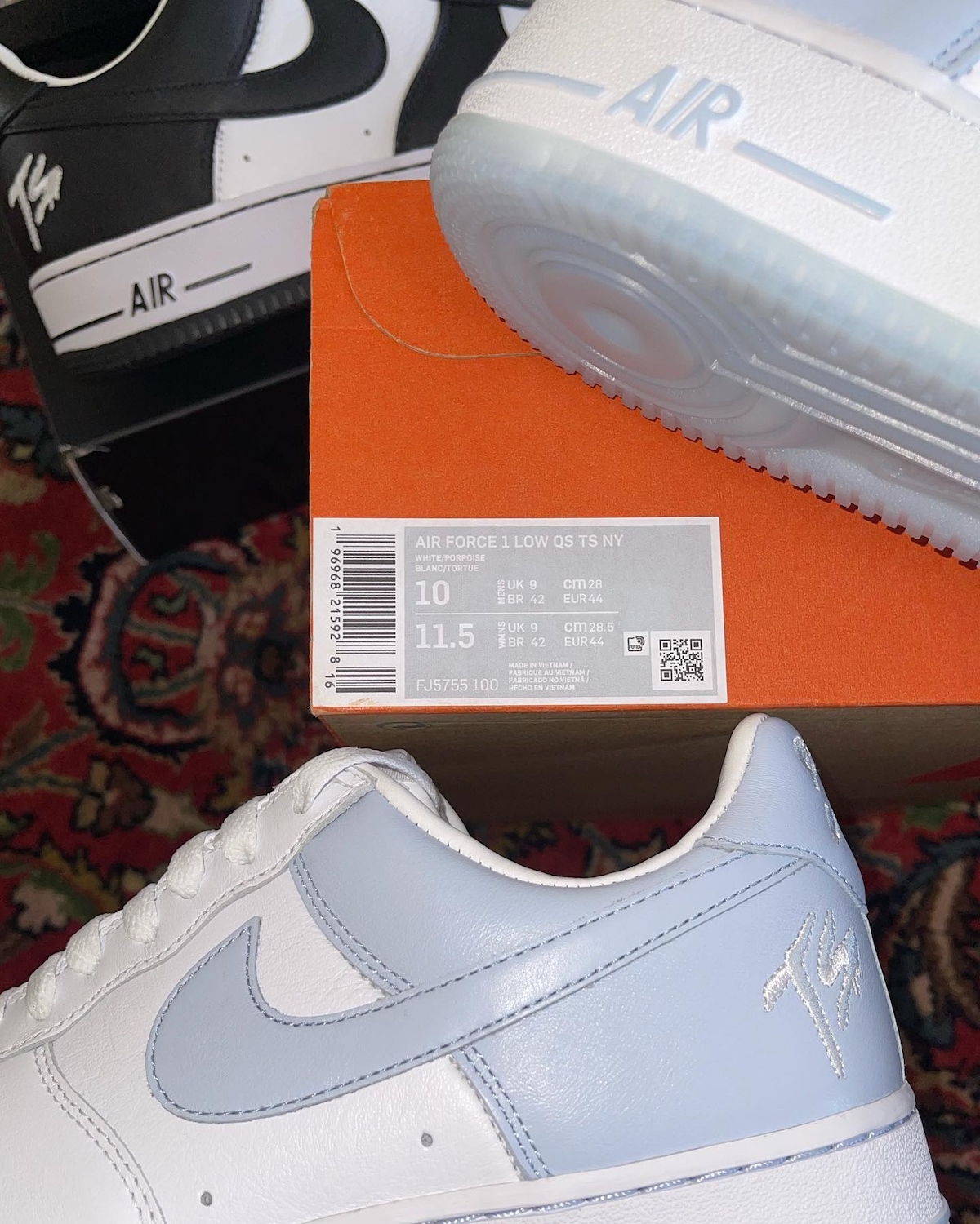 Following the earlier preview of the ‘White Black’ iteration, the second pair of the Nike Air Force 1 Low for Terror Squad introduces a clean White and Porpoise color scheme. The base of the shoe is predominantly White, while Porpoise, a light shade of Blue, accents the heels, tongue labels, and Swoosh logos. Adding to the distinct branding, the ‘TS’ logo is embroidered on the lateral heel, while ‘JC’ (representing Joey Crack) graces the heel tabs. Additional details include a White midsole and an icy translucent outsole, completing the overall design.