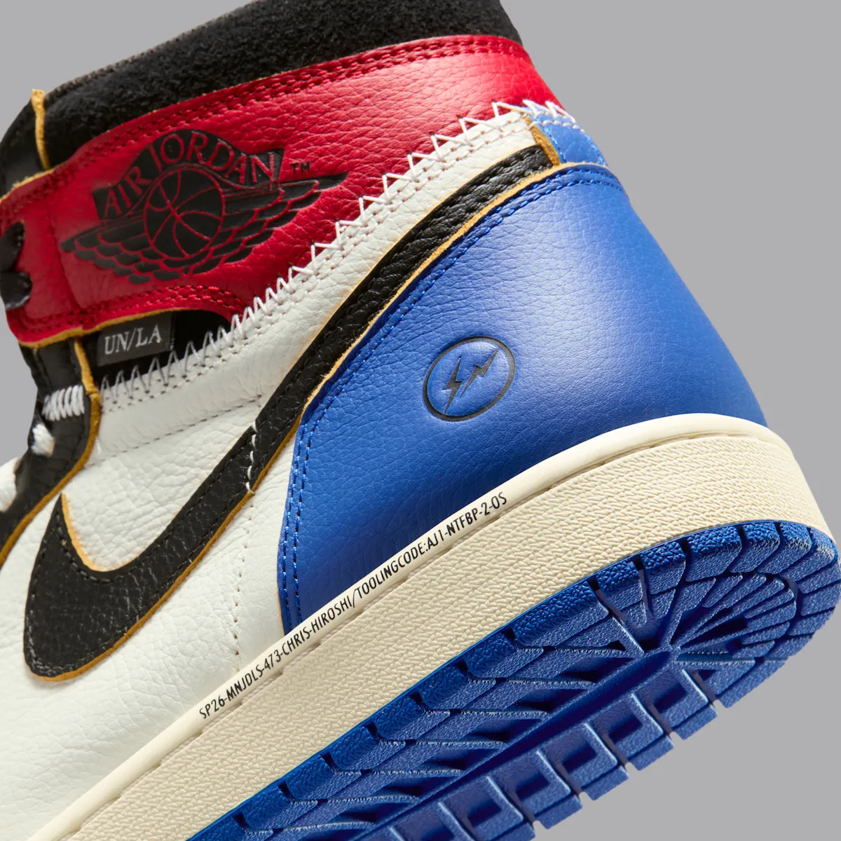 This pair comes dressed in a Black/White-Varsity Red-Sport Royal color scheme. The design clearly nods to the legendary Union LA Air Jordan 1 “Black Toe”, but with Fragment’s signature Royal Blue hits on the heel and outsole, along with their unmistakable double-lightning bolt logo stamped near the heel. Other features include: