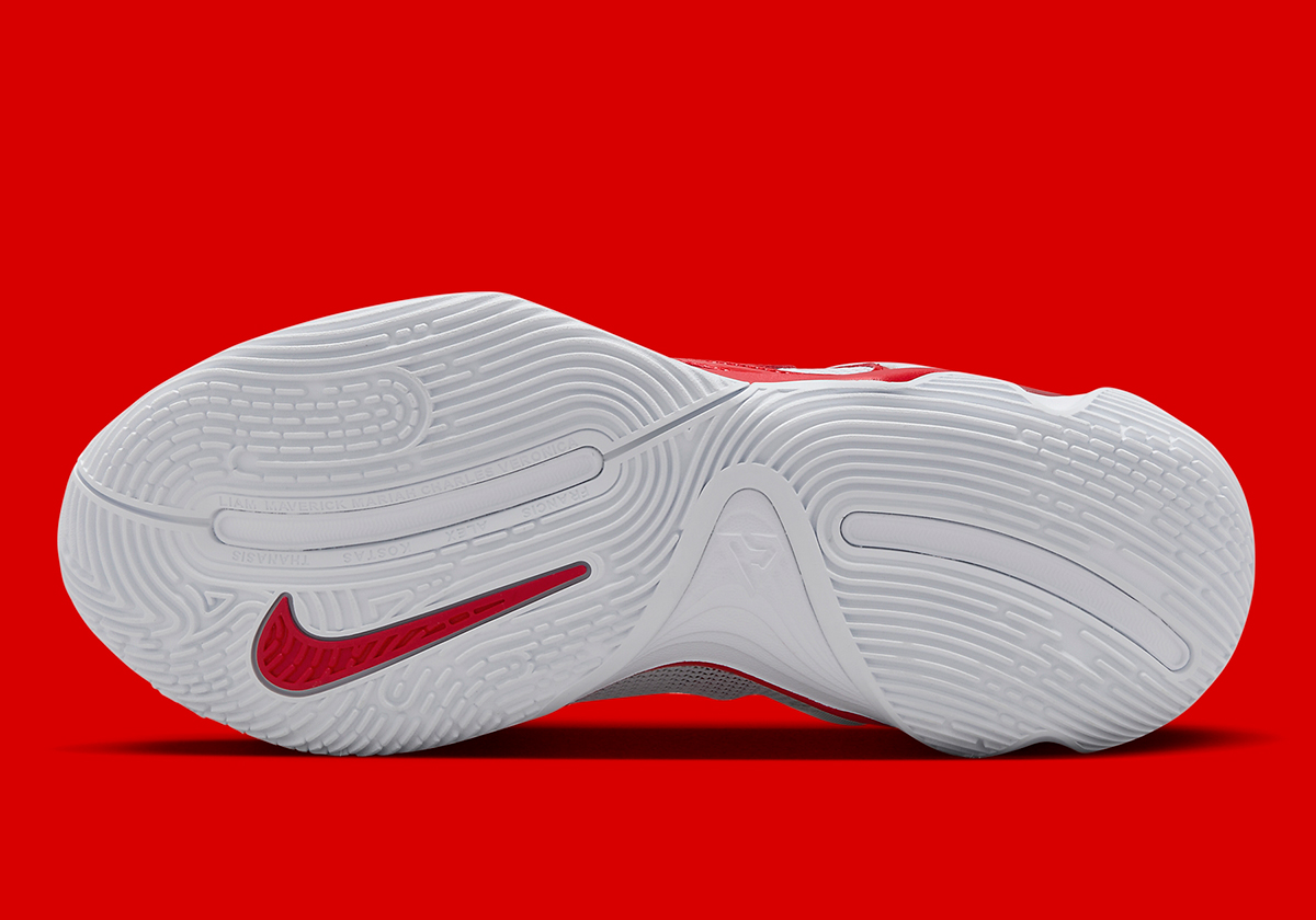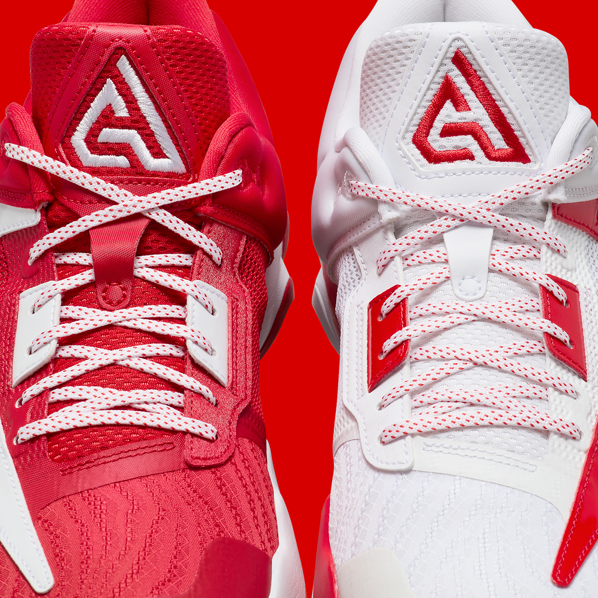 Naturally, the shoes boast a Red/White color scheme to match the Kobe 4s Giannis wore five years ago, as well as the Eastern Conference’s traditional jersey color. In a rare but familiar move, the left and right shoes are inversely colored, switching from red to white on nearly every element except the laces. While Giannis wrote “Thanks for sharing” on the toe of the Kobe 4s, it appears split in two parts on the heel tabs on this pair.