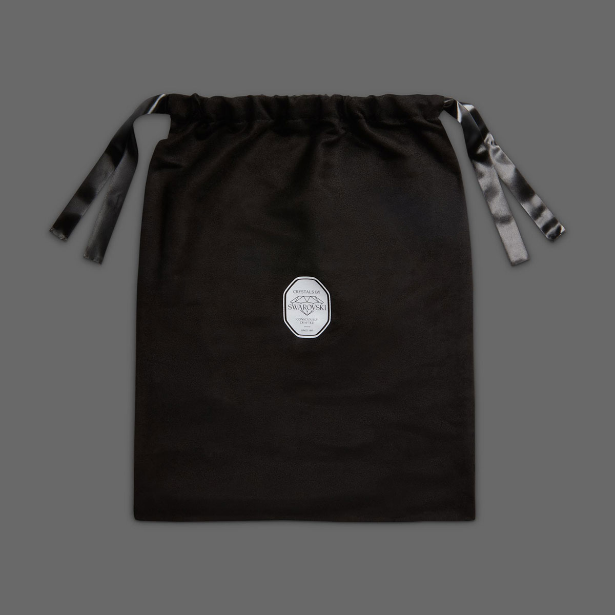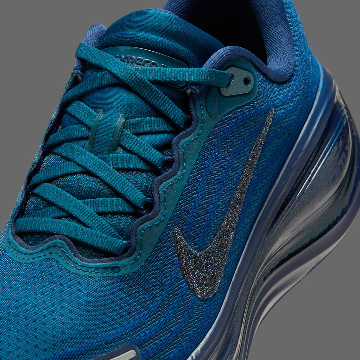 Once again, the design starts with a monochrome base that blends different oceanic shades of blue and teal. To avoid adding unnecessary weight or rigidity, the crystals are confined entirely to the lateral Swoosh, arranged in a grainy, sand-like texture. The shoe’s ultra-cushioned ZoomX midsole comes with a subtle glittery finish, evoking a starry night when paired with the blue backdrop. A set of teal ribbon laces is included, as is a black Swarovski-branded dust bag.