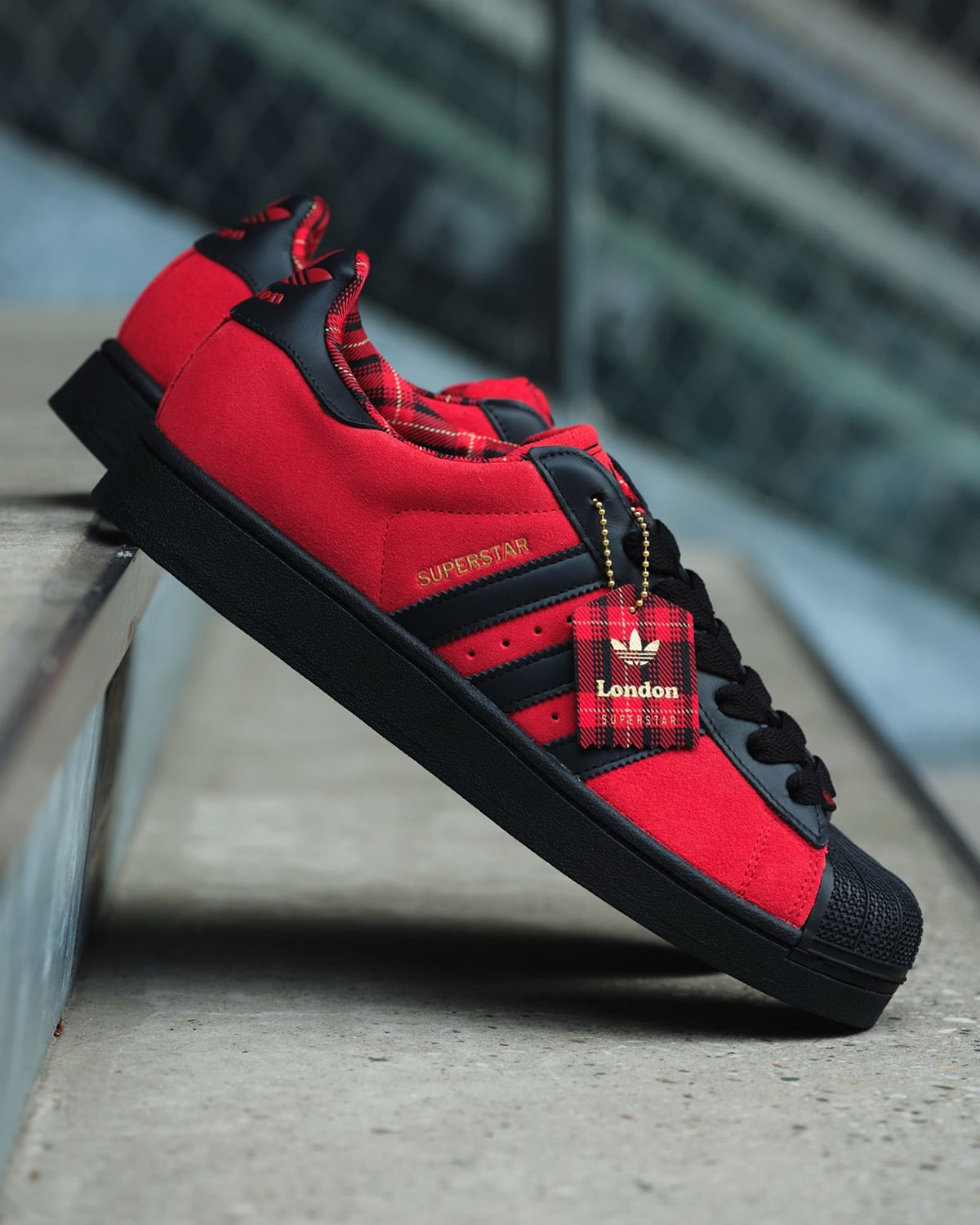 Continuing a well-rounded run of releases that have occurred throughout 2025, this Superstar pays homage to the UK capital with a red plaid (tartan) sockliner. Red suede covers the side panels, while black accents hit the stripes, back-tab, eyestays, and shell toe to give the sneaker a sharp edge. Serif text reading “London” sits beneath Trefoil logos on the back-tab and tongue, while a plaid hangtag stamped with “London” in gold reinforces the theme of the release.