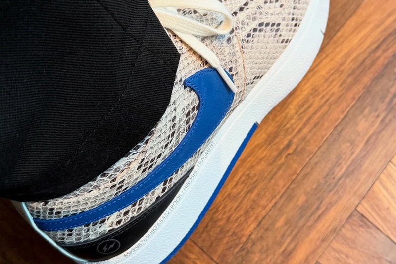 Devin Booker and Hiroshi Fujiwara have been busy cooking up a new collaboration. These past few months, Booker has been spotted countless times hanging out with the Fujiwara, seemingly teasing a partnership. Now, it appears that they have been working on a new shoe collaboration that combines style notes from the Nike Book 1 and fragment design.Taking a page from the Nike Book 1 "Python", Fujiwara too to Instagram to share a teaser of what to expect from the new shoe. The entirety of the upper appears to be covered in the python texture with a pair of white laces to tie it all together. What differs from the original "Python" colorway is the Swoosh. fragment design's signature blue hits the Swoosh and parts of the outsole with black counters hitting the heel to complement the design. fragment design's signature dual thunderbolt logo is also on the heel counter. The shoe sits atop a white midsole and outsole to round it all off. At a closer glance, there seems to be a product code number that reads "RSKB98765NIKE65432BOOK/HIROSHI FRAGMENT." It is uncertain if this is a design spec of a note that depicts the sample shoe. It has not yet been revealed if this is just a PE or for friends and family. Look out for more information on whether or not the collaboration is dropping for a general release. View this post on InstagramA post shared by Hiroshi Fujiwara (@fujiwarahiroshi)Click here to view full gallery at Hypebeast