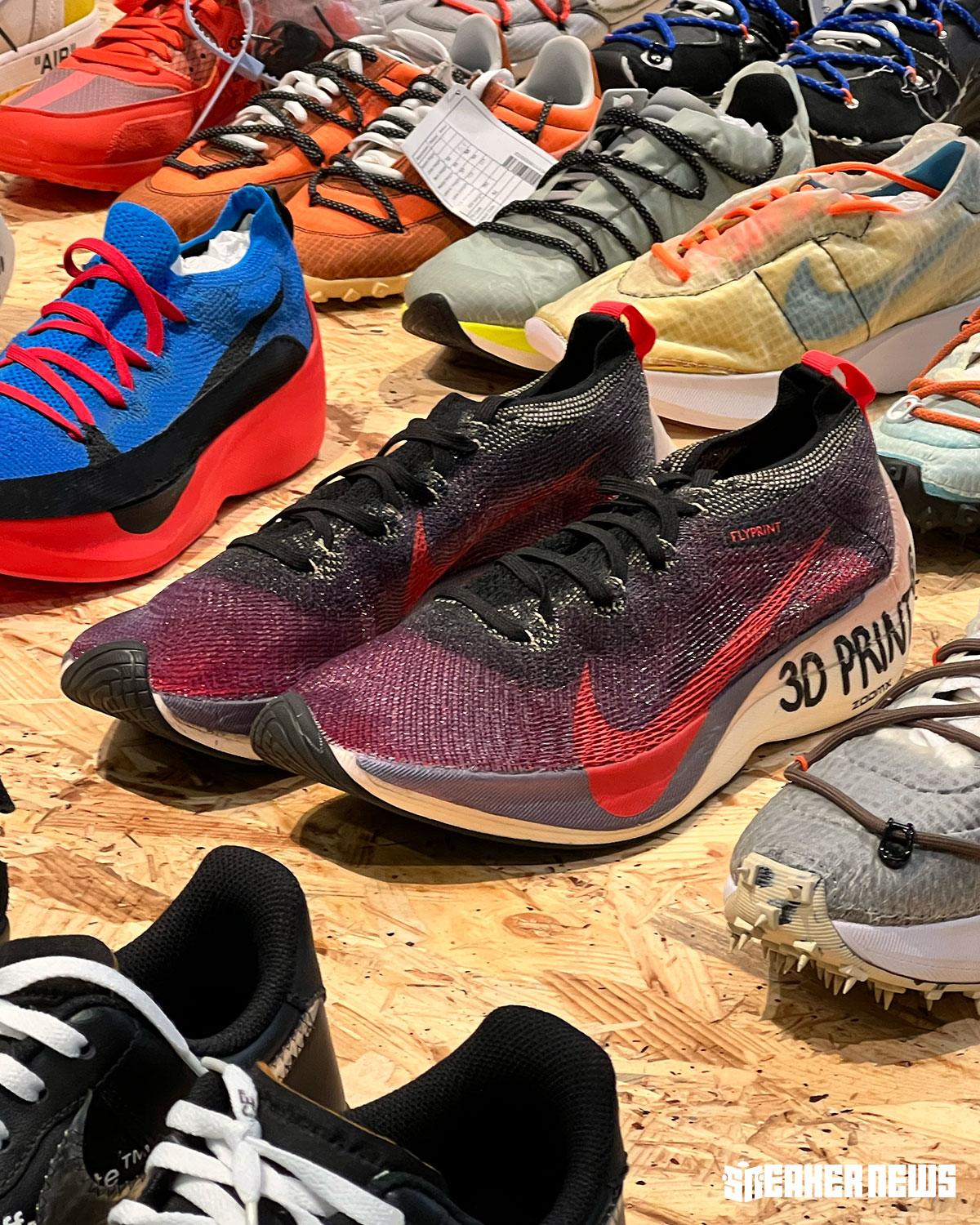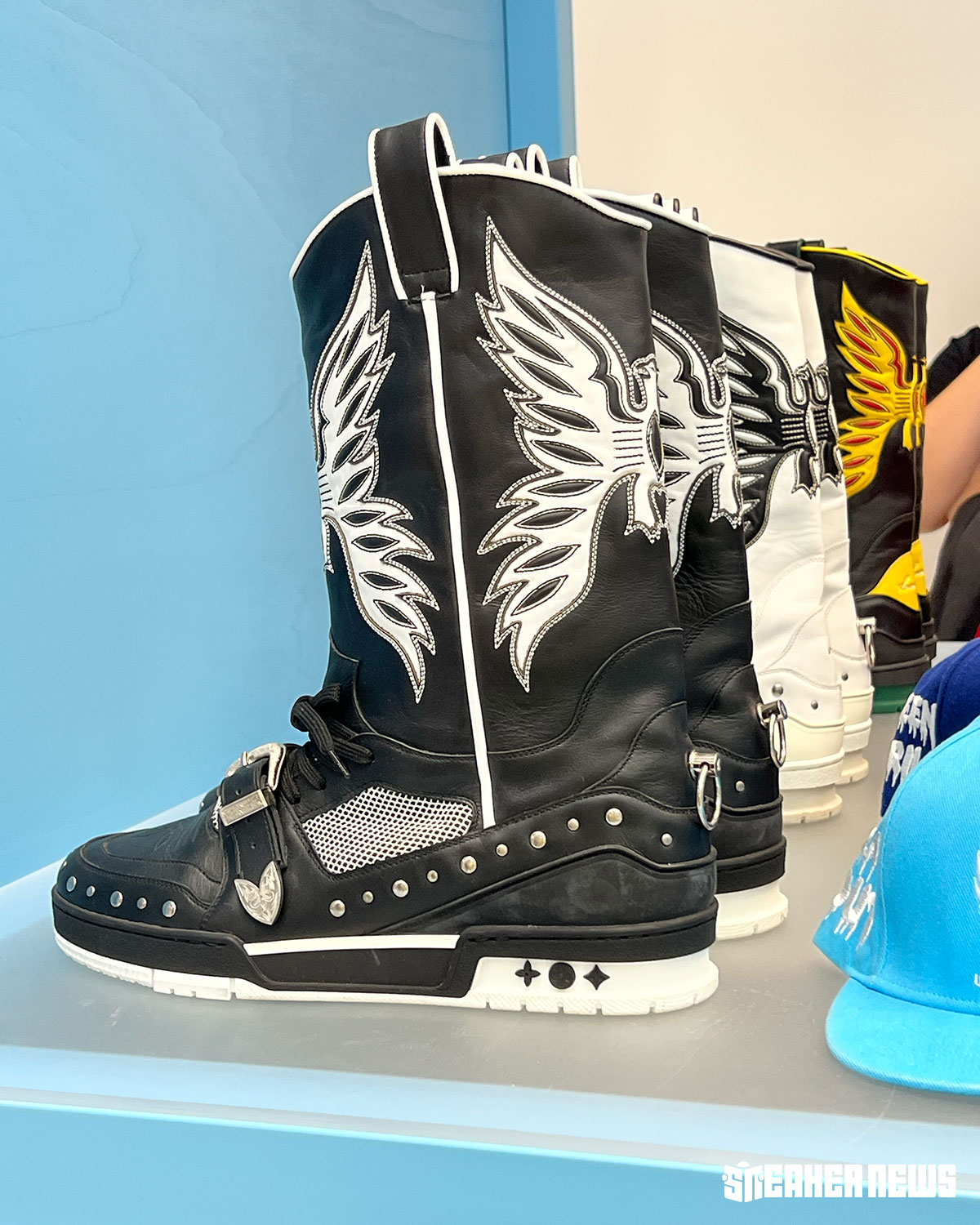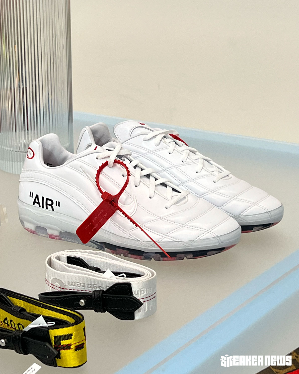 First up is an unfinished version of the ground-breaking Off-White x Air Jordan 1 “Chicago”; this version does not include the transparent nylon panels, Swoosh, stitching, wings logo, and “AIR” text on the midsole. Next is Virgil’s take on the Nike Cryoshot Tiempo; the off-the-pitch iteration of the iconic boot features all the DNA of the The 10 with a clean white upper, black “AIR” lettering, and red zip-tie hangtag. There was also a cowboy boot version of the Louis Vuitton Baskets, the mythical “Canary Yellow” Off-White Air Jordan 1, the unreleased “Bred” Off-White Air Jordan 4, and many more. All of the shoes (and much more) were displayed on the first floor of the exhibit.