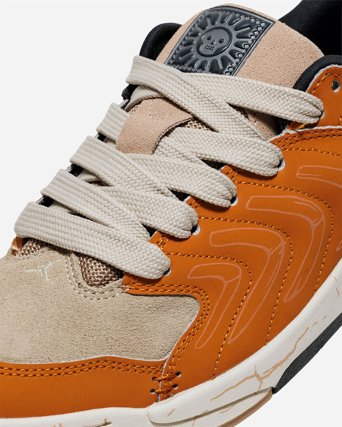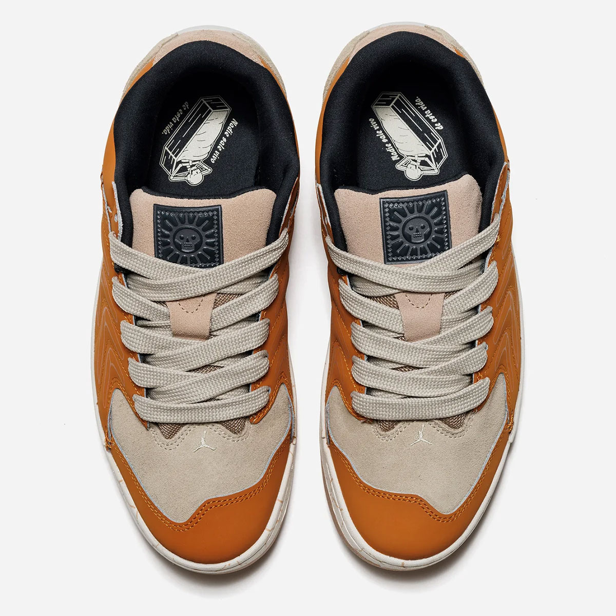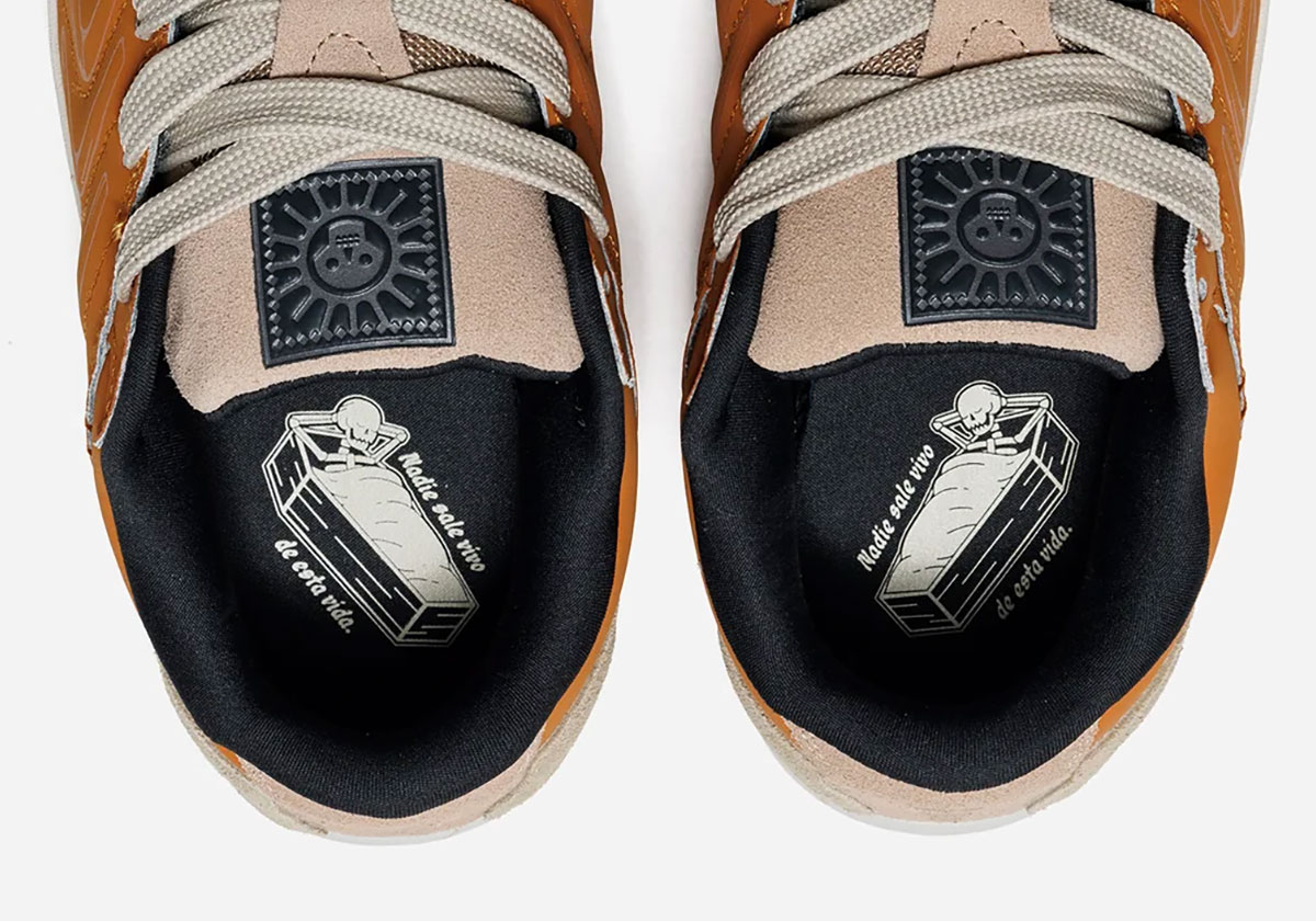 Yes, the 2025 product, marketed as Jordan’s first skate shoe, now joins the Retro silhouette in a budding pack. Rather than the softer, vibrant hues utilized there, here we see a closer embrace of eartheir, dare we say, spookier tonality throughout. Functionally radiating out from a stealthy skull-laden tongue tag, archaeological aesthetics also pace through the whole shoe, including a ribcage pattern on the wavy sidewalls and cracked prints on the midsole. For the most playful detail, look inside the shoe, where a skeleton kicks back inside of a coffin, accompanied by “Nadie sale vivo de ceta vida” text (“No one gets out of life alive.”)