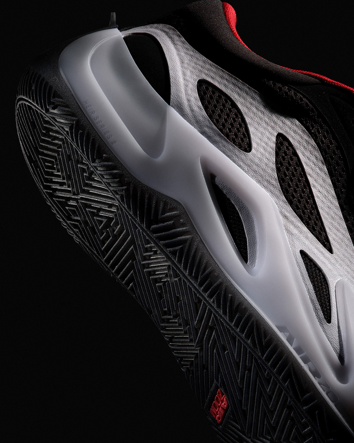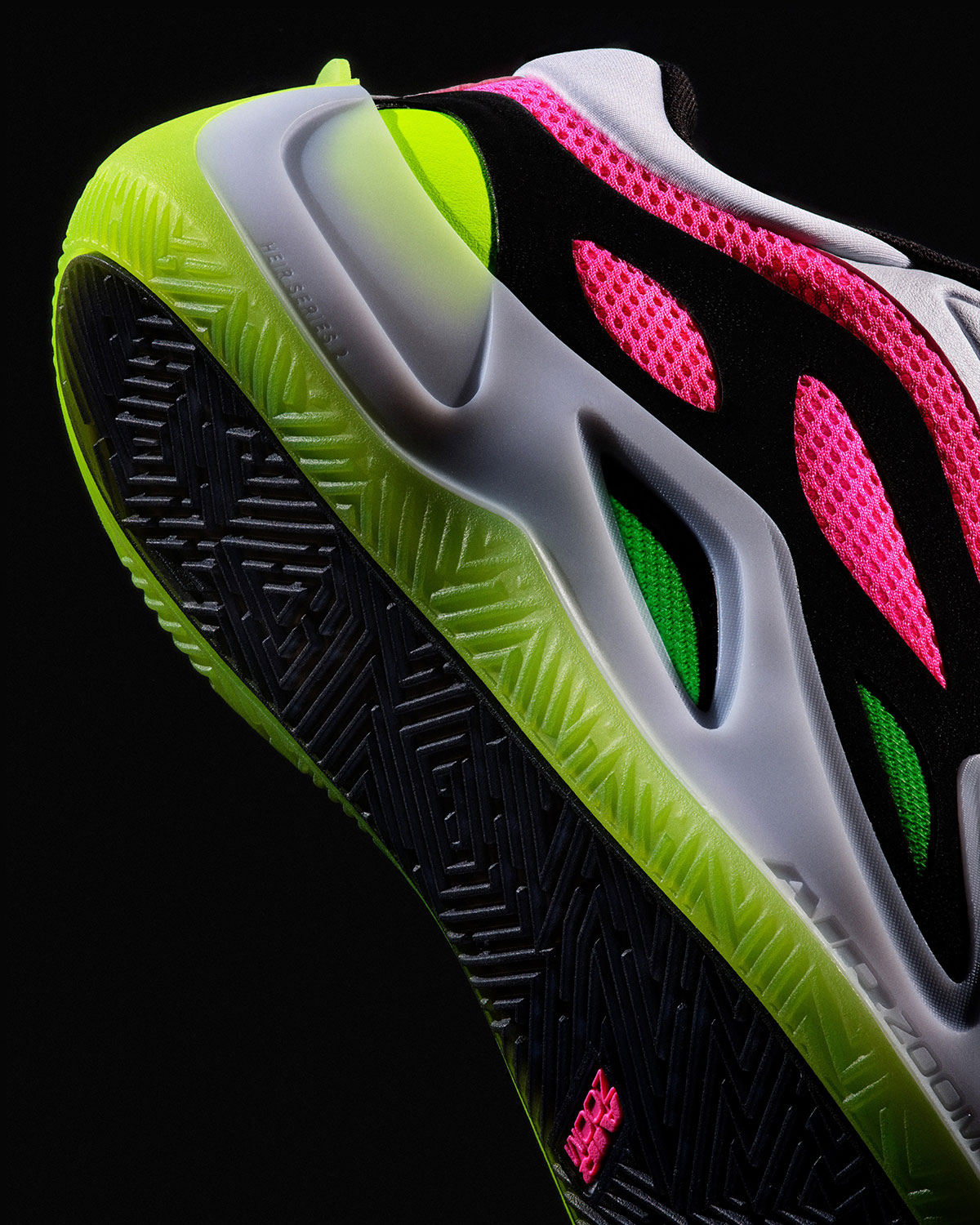 Though the link back to the Heir parent (apparent?) are visible with the webbed containment on the side, there’s no denying that the Heir Series 2 delivers more of a premium air, bridging that pocked design language into an extended sole that serves almost as a flange on the sides. In the cushioning package, drop-in Cushlon 3.0 pairs with a new forefoot Zoom Air unit, while the traction pattern goes full-length rather than the zonal arrangement from 1.0. In an already well-regarded, clever touch, each pair also arrives with a hair tie, removable but acting as a pull tab at rest.