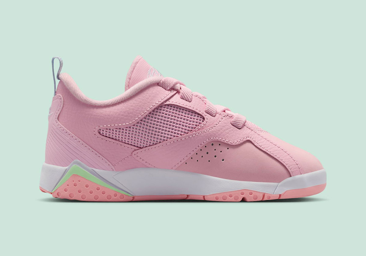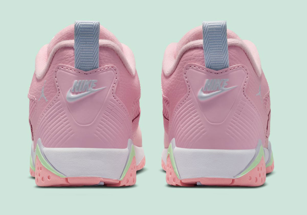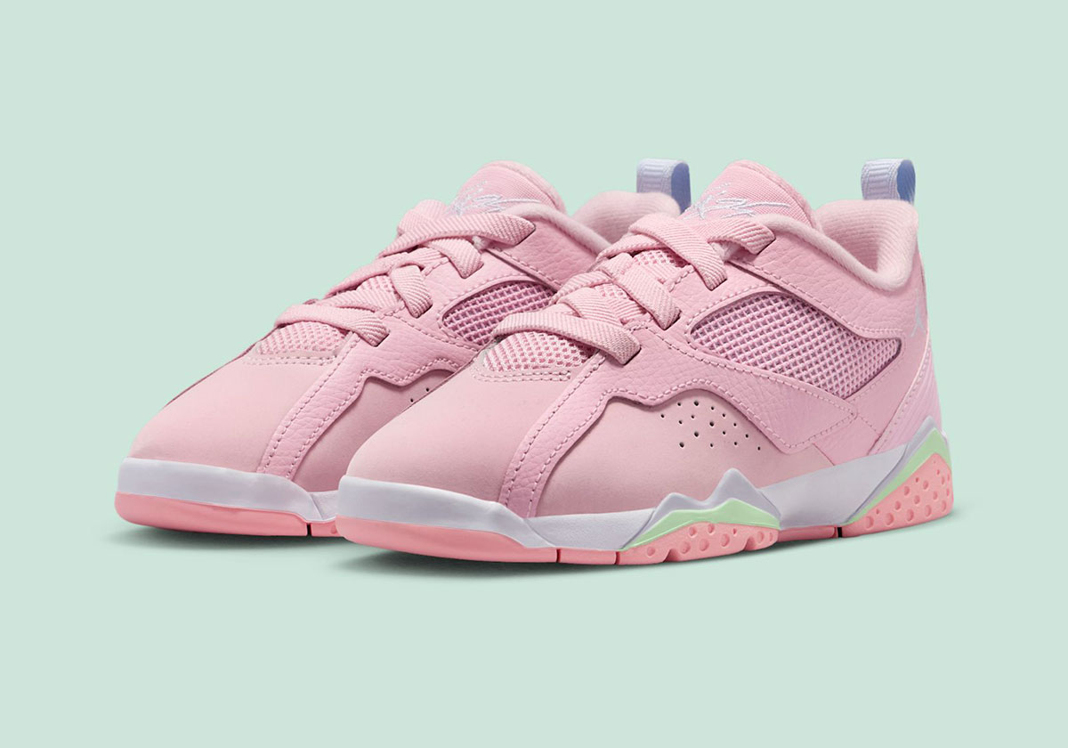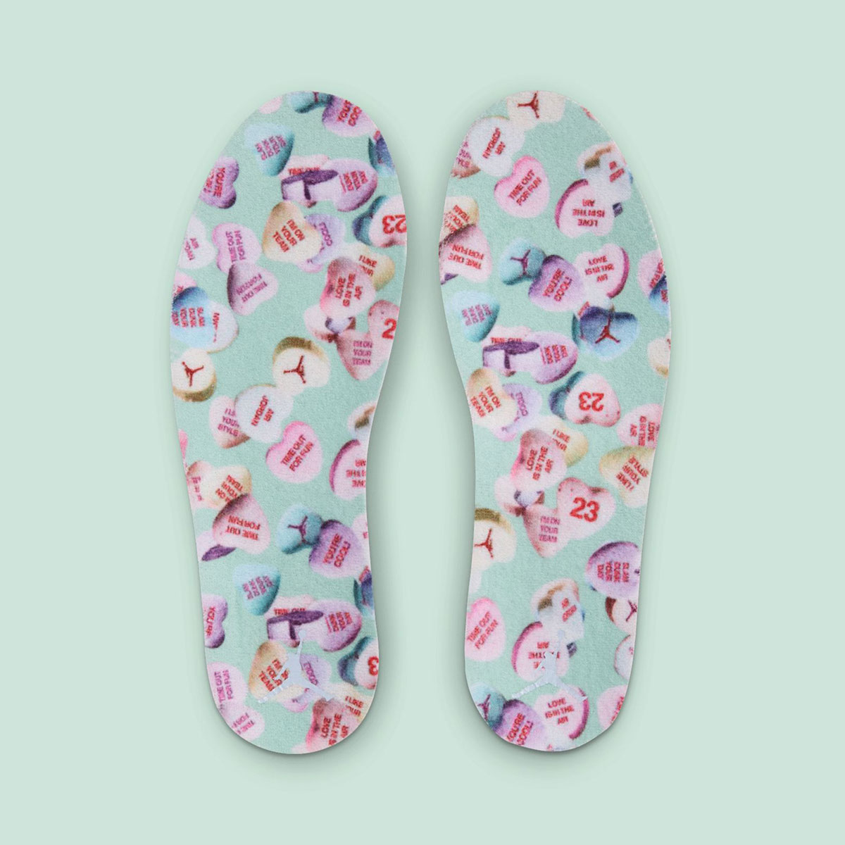 The design pulls directly from those classic heart-shaped candies stamped with sweet messages you probably gave to a grade school crush. A soft Medium Soft Pink upper sets the tone, while Vapor Green and Half Blue accents appear underfoot. The Jordan MVP 92 itself is a new low-top takedown silhouette reminiscent of the Air Jordan 7, borrowing its midsole tooling for a familiar foundation. Inside, custom insoles feature heart-candy graphics with Jumpman logos and playful messages.