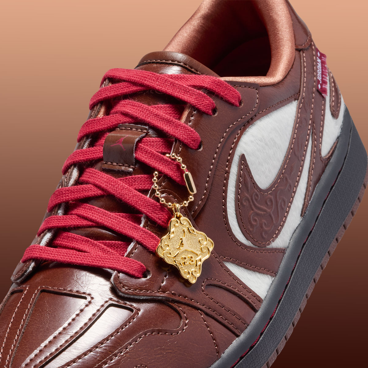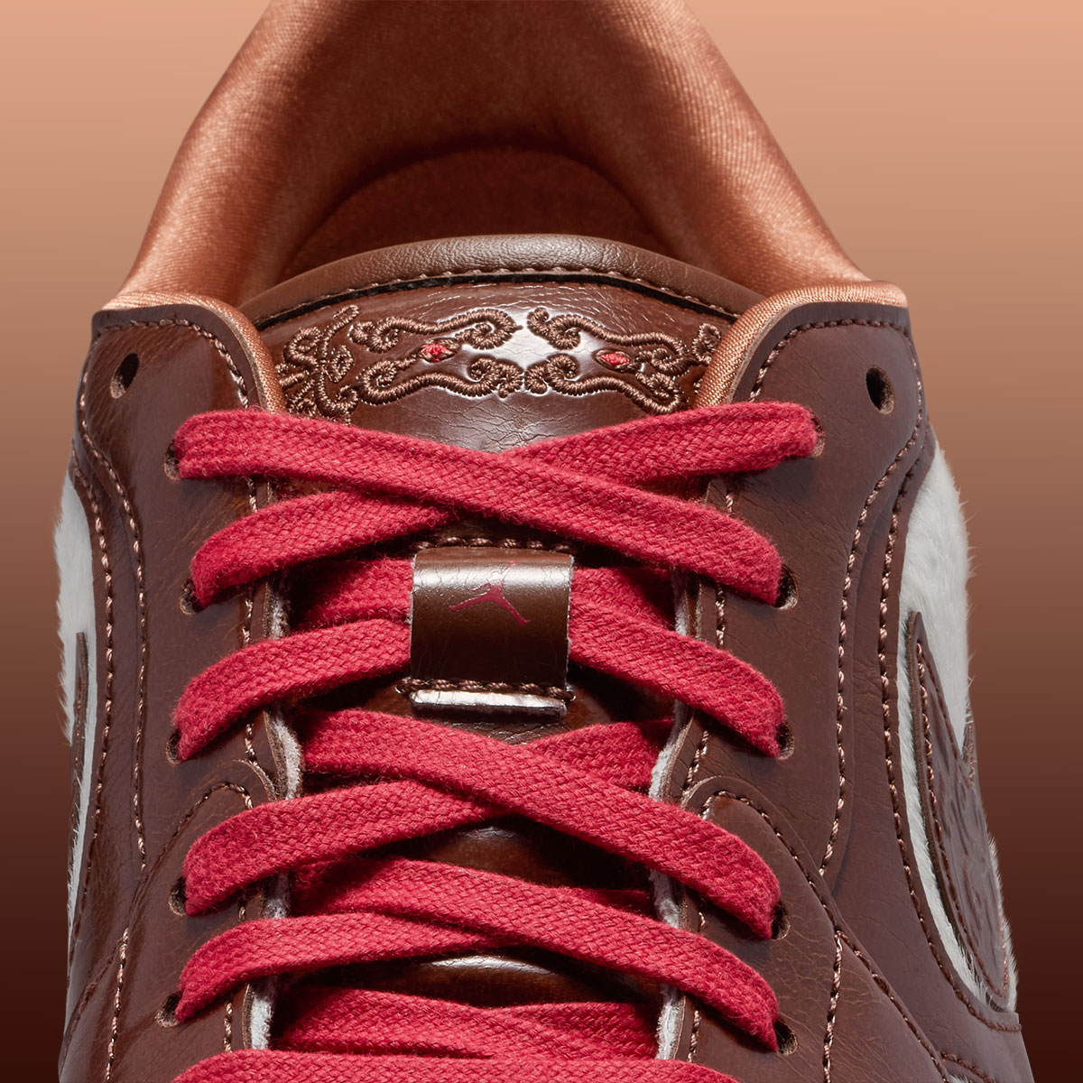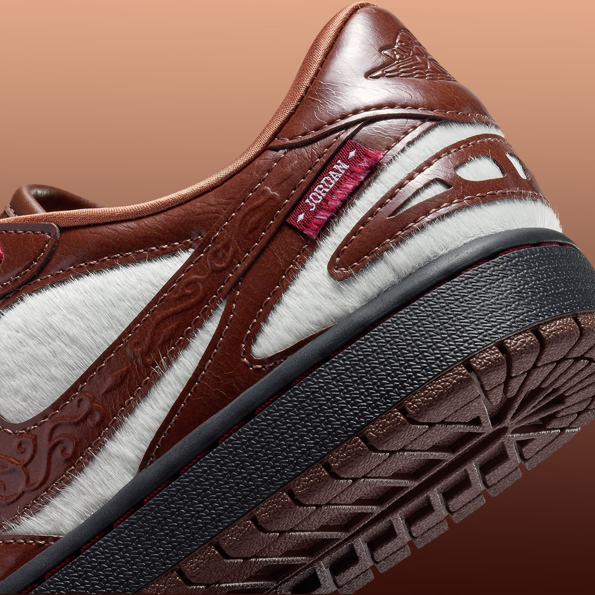 The v3 stands out with an elaborate layering scheme akin to the Vomero 5 and other tech runners, but this iteration delivers less of a Y2K aesthetic and more of a brogue-style feel. The outermost layer is made from brown Light Chocolate leather, with the Swoosh given intricate detailing that feels in equal parts traditional Chinese and American southwestern. That cowboy-like aesthetic extends onto a leather tongue as well as the insoles, the latter given stylized Jordan text. The lateral side features a branded Jordan tag in Team Crimson, while a Metallic Gold Chinese New Year-inspired hangtag is included. Underneath it all lies white faux pony hair, adding even more textural depth to an already elaborate design. Underfoot we have a black midsole featuring red contrast stitching as well as a Light Chocolate outsole.