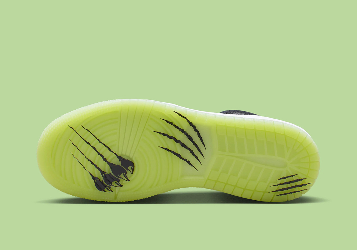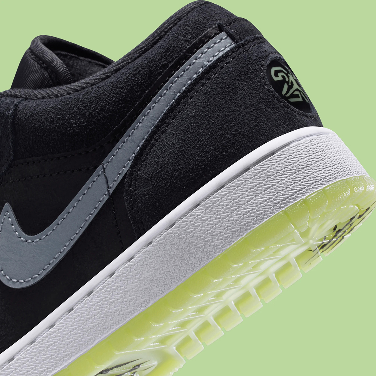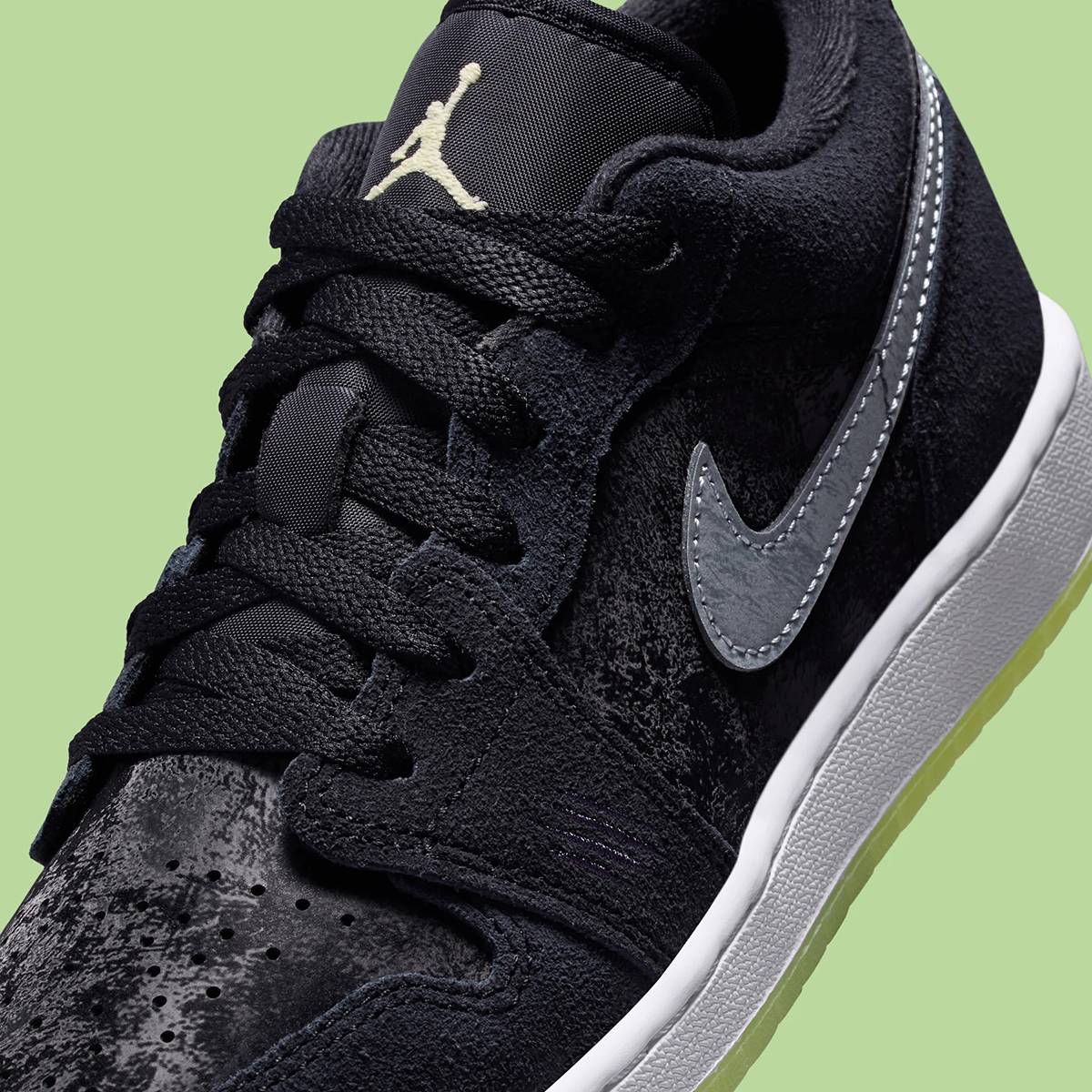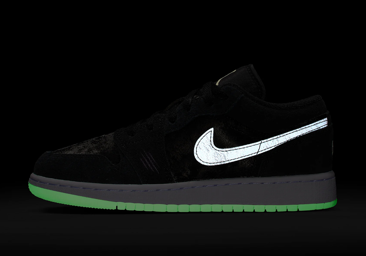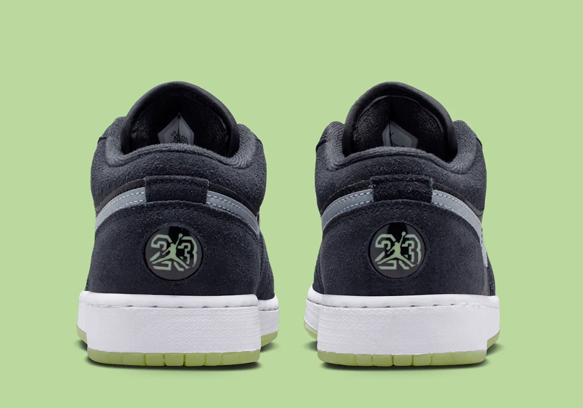 If you caught our coverage on the 11s, this Jordan 1 Low should strike a familiar note. It carries over many of the same design hallmarks — led by a glow-in-the-dark outsole, a textured black finish over the toe box and quarter, and claw-like markings on the lower eyestay of the lateral side, tying in perhaps with the “Black Cat” 4s. Black suede overlays complete the rest of the upper, complemented by circular buttons featuring “23” and Jumpman logos on the heel in lieu of the traditional Wings logo.