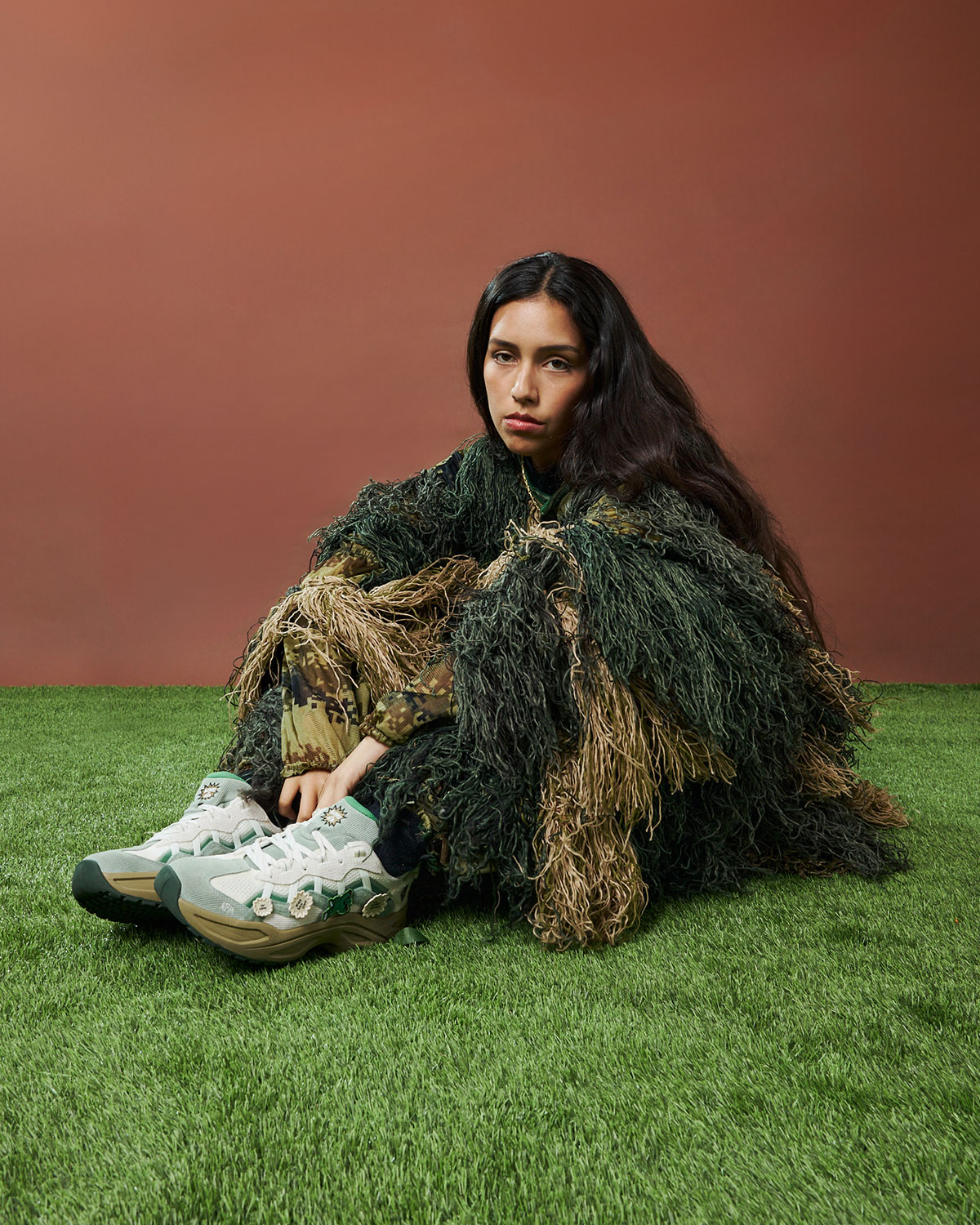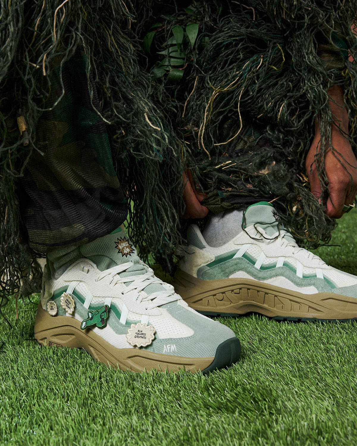 Built off the platform of the already-existing Marina, one of the brand’s stronger embraces of chunky 90’s style, the RMX’s hardware speaks to the “Get Me Out The Woods” motif at the heart of this partnership. On top of evoking natural imagery and linking to Miles’ latest musical era, the concept lights the remodeled upper, utilizing dense multi-media applications with mesh underpinnings, corduroy toes, and jagged suede overlays.