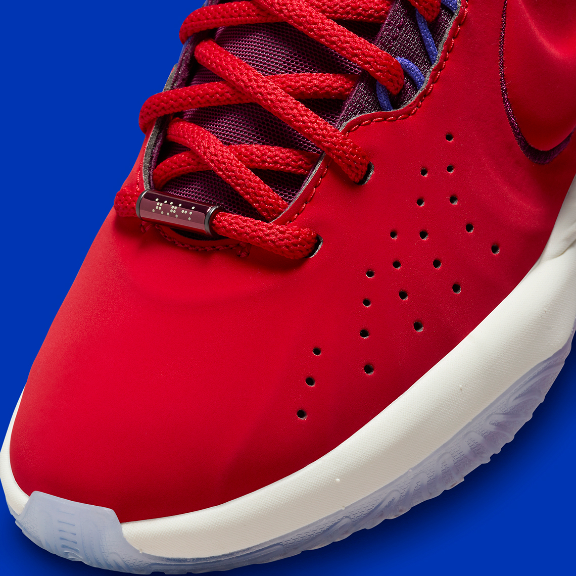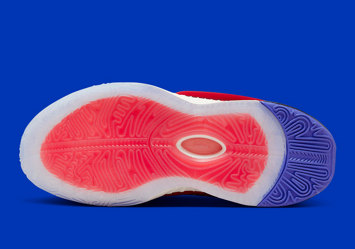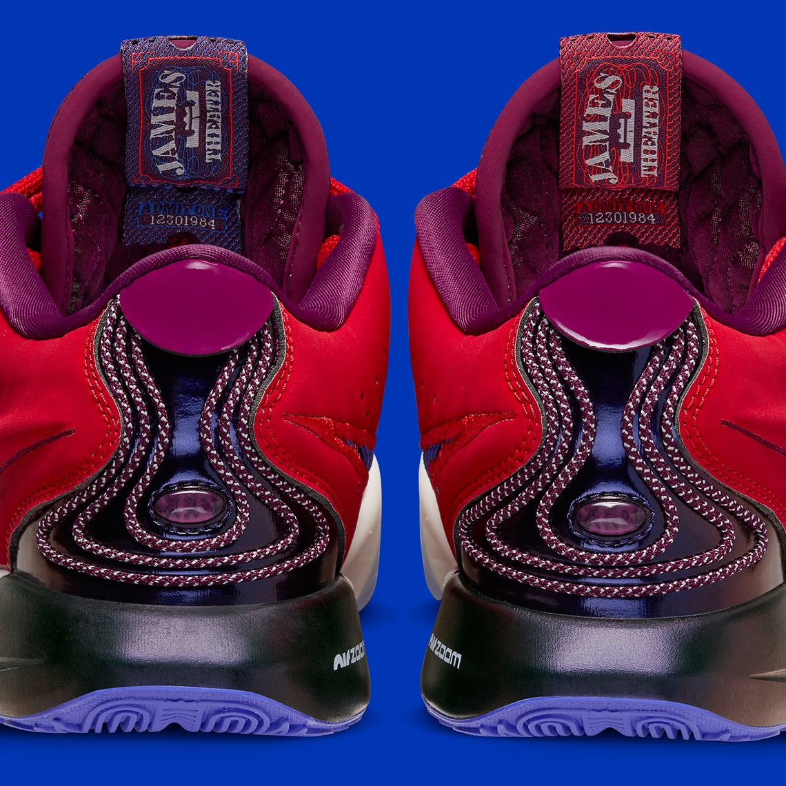 Initially previewed back in August, the regal color blocking has since made its way to official images. Embarking upon the model’s first nubuck-coated effort, the clad-textured upper is draped in a singular “Track Red” hue while an accenting collection of “Bordeaux” ascertains the mesh tongue, quarter and inner lining. What’s more, a luminous violent tint consumes the heel counter featuring an iridescent finish while a faint ice blue shade illuminates the tread underfoot. As for the colorways’ namesake, the “James Theater” is harkened to throughout the model, rendering ticket stub-reminiscent tongue tabs and popcorn-coated insoles. The latter is also met with popcorn bucket and 3D glasses at each heel – providing further clarity to the pair’s blue and red inspiration.