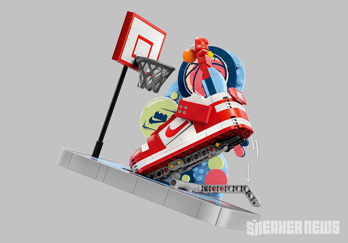 Here we have official Nike images of two sets expected to release in 2025. The “Nike Dunk Trickshot” consists of 454 pieces and features a LEGO figure standing on a red “St. Johns” low-top. The Dunk is attached to a moveable LEGO board underneath, allowing you to move the shoe and make the figure dunk into the hoop at the front.