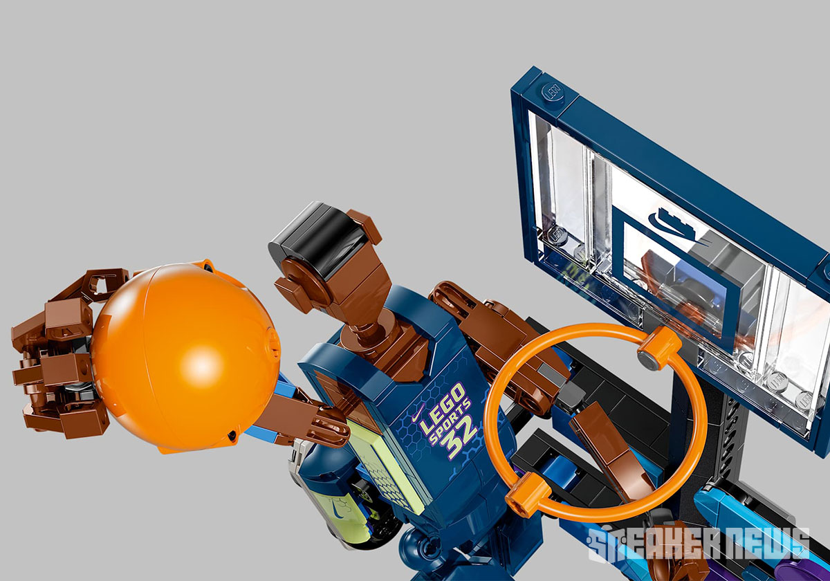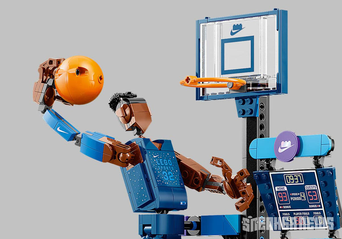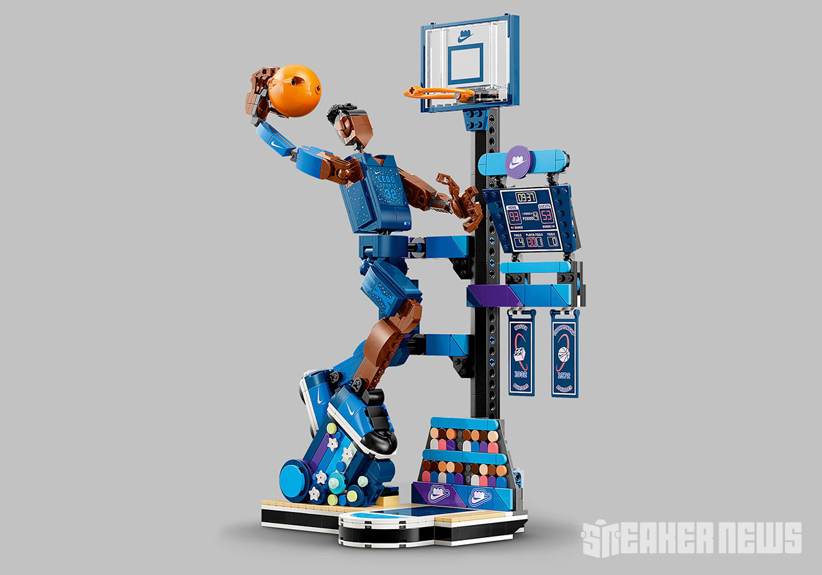 The other LEGO Nike set is called the “Slam Dunk” and contains 809 pieces. Here we have an ambiguous hooper dunking into a hoop, complete with a front court, score board, and even fans in the stands.