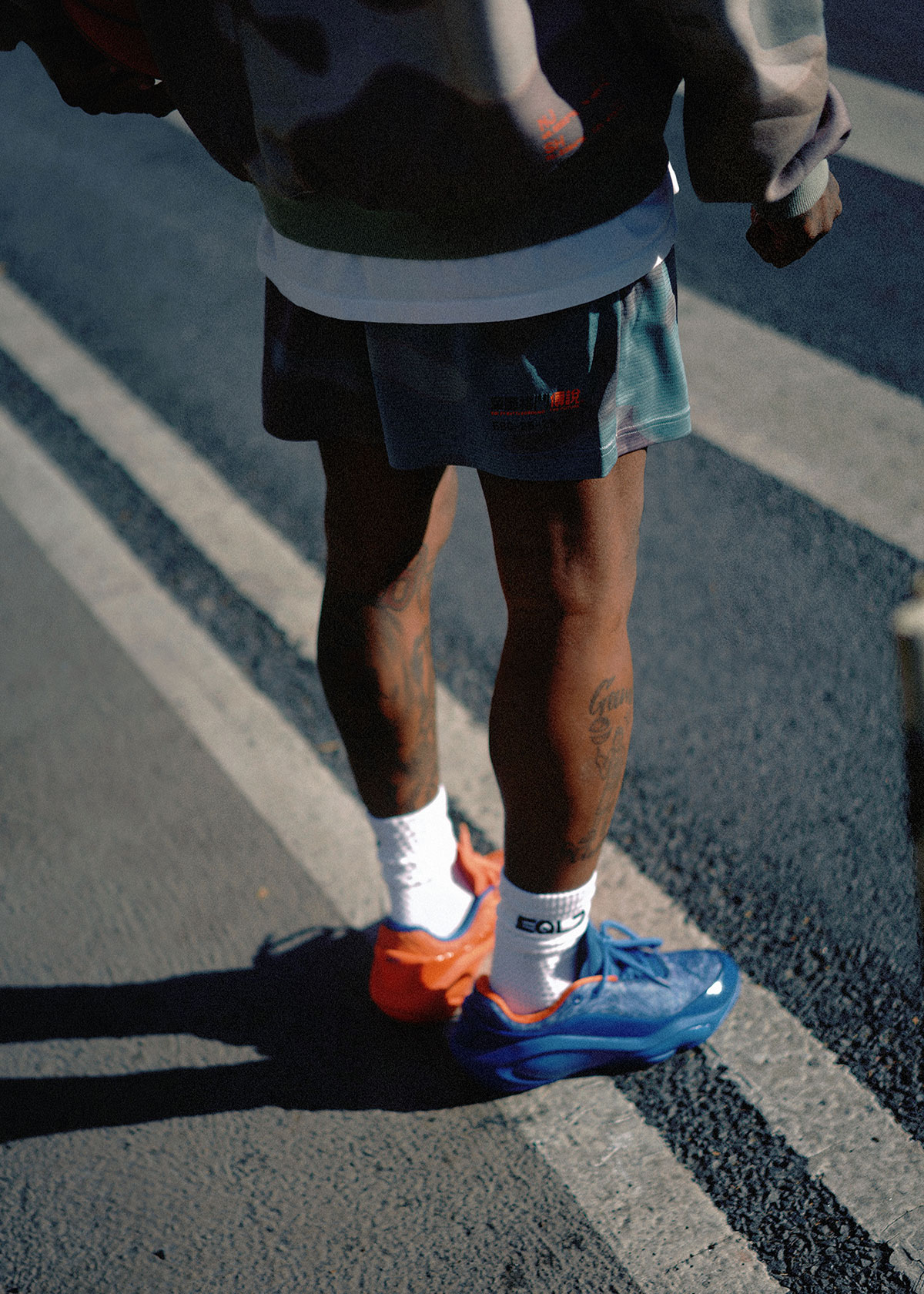 Those dual inspirations come together through a mismatched color scheme, with the left shoe dressed in blue and the right in orange. One insole pays homage to the Big Apple with Frank Sinatra’s “If you can make it here, you can make it anywhere” line, while the other reads “Beach Boyz” alongside a beach ball graphic.